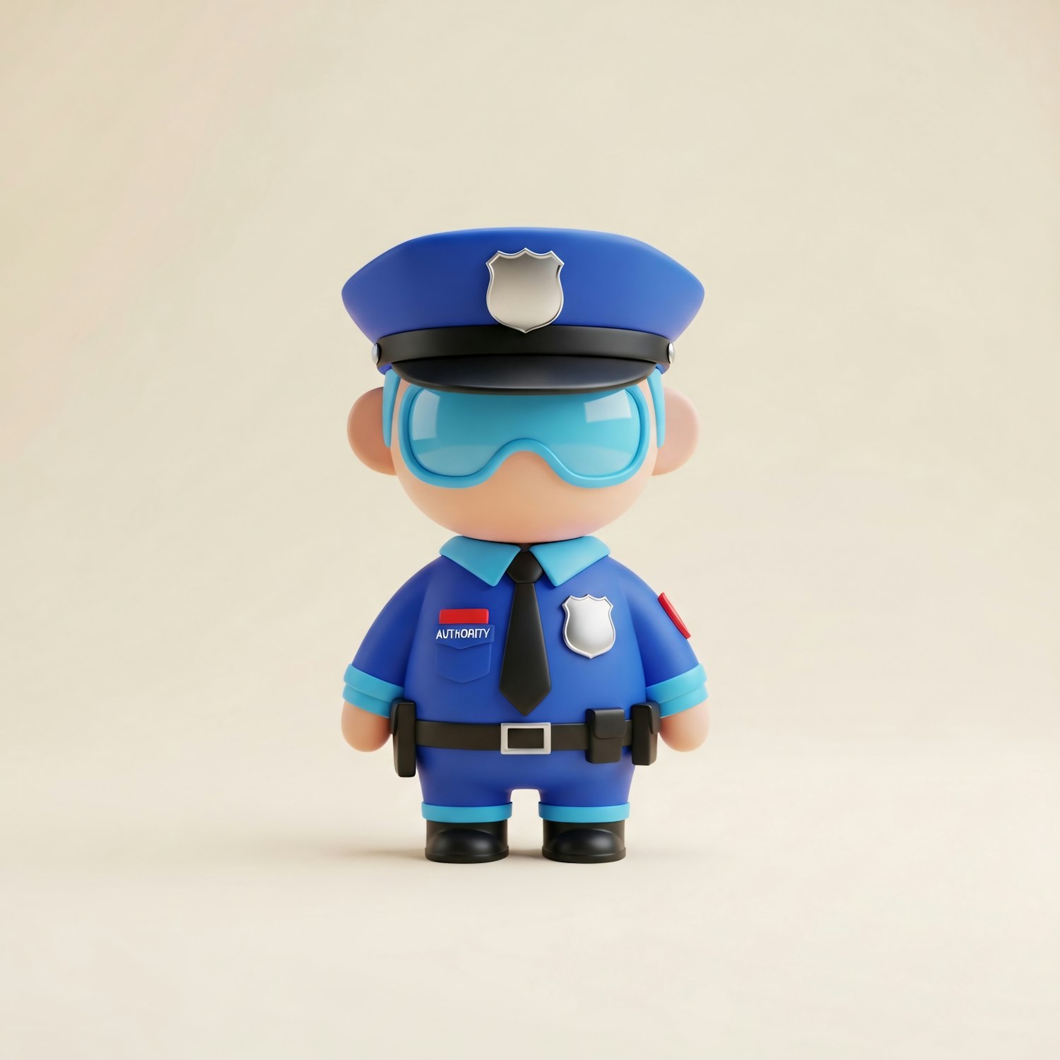 A cute cartoon police officer figure in a blue uniform with a badge and goggles, set against a plain background.