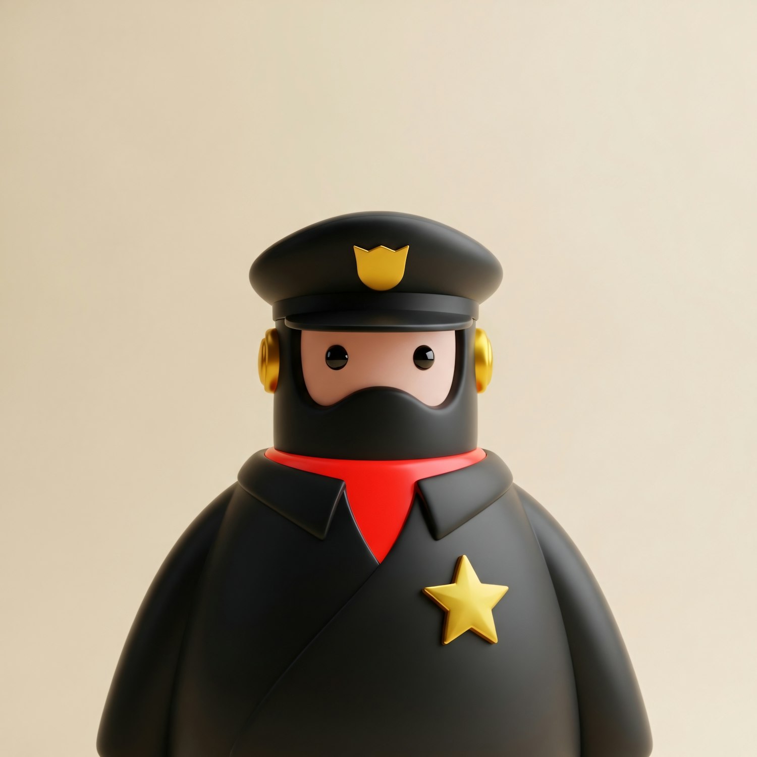 A 3D cartoon-style police officer character with a black uniform, golden badge, and red scarf, designed with a smooth and polished look.