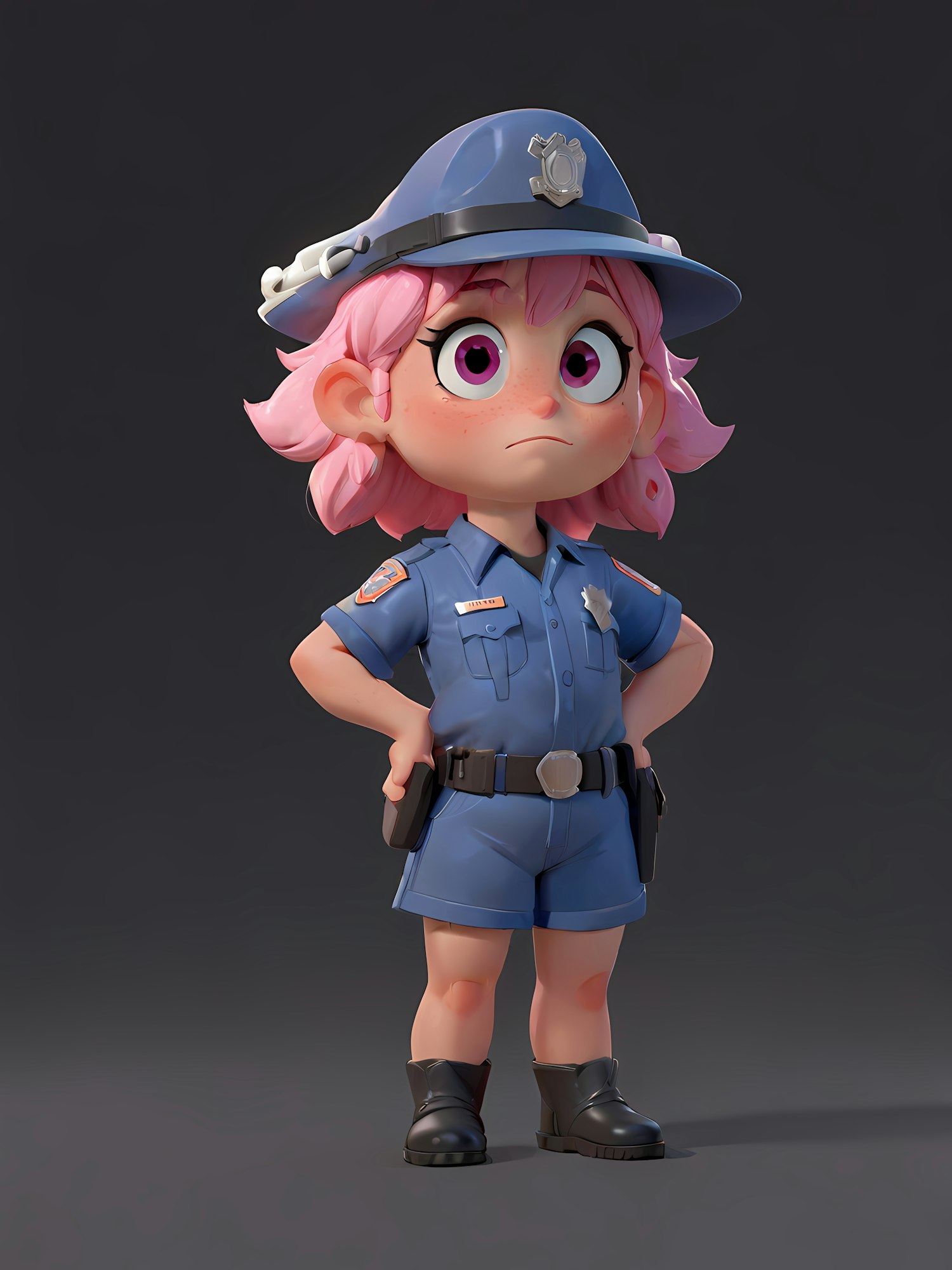 Adorable 3D cartoon police officer with pink hair, expressive eyes, and a detailed blue uniform. Perfect for creative or playful projects.