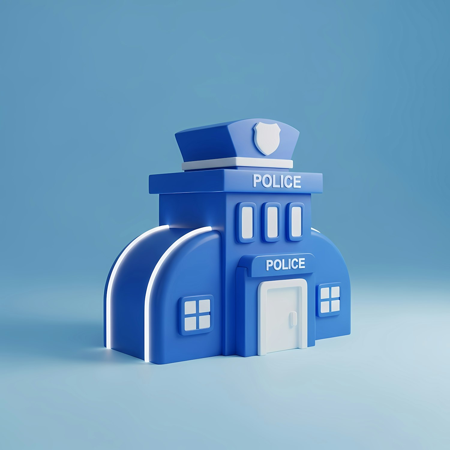 A 3D illustration of a cartoon-style blue police station with a police hat on top, set against a light blue background.