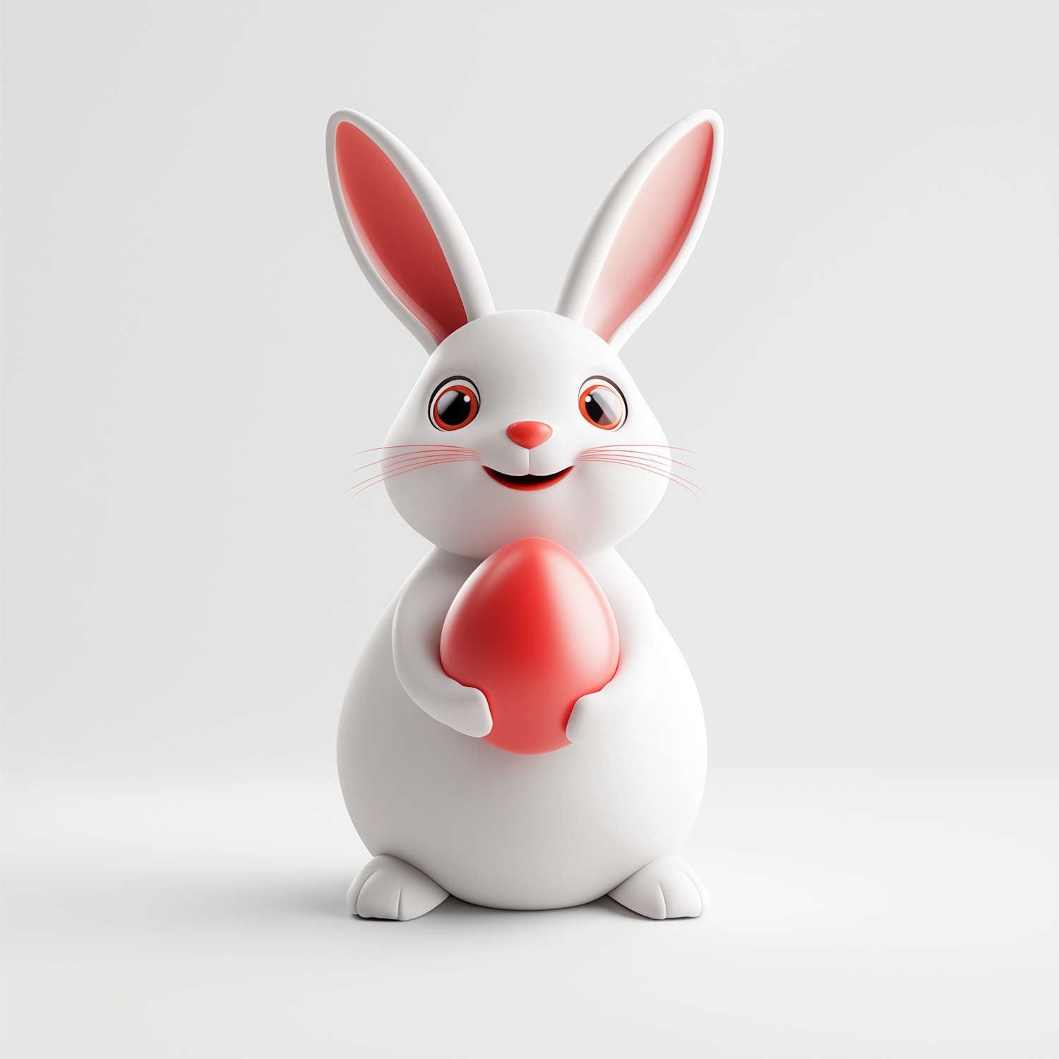 Adorable 3D cartoon rabbit holding a red egg, with pink ears and a cheerful expression, set against a clean white background.