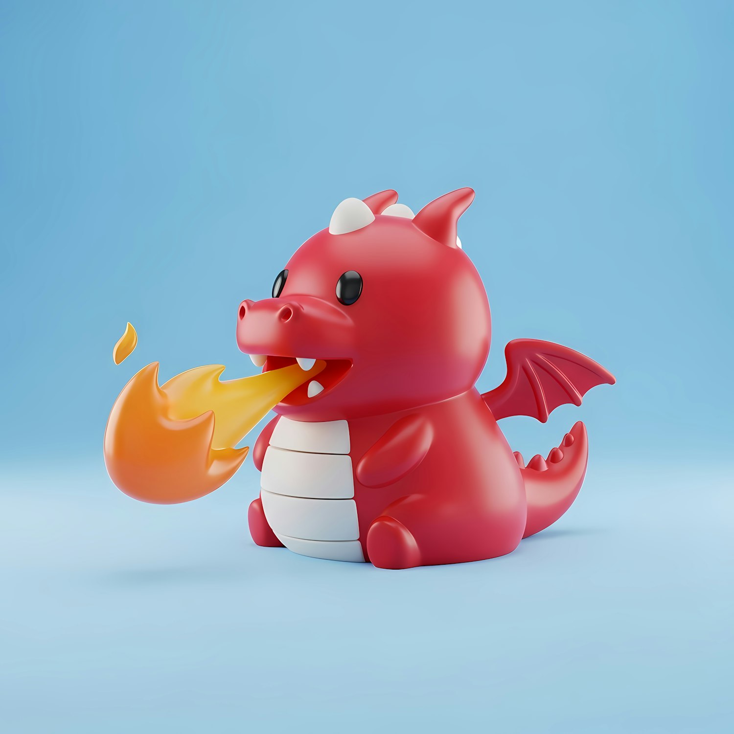 Adorable red cartoon dragon breathing fire, with a playful design and vibrant colors, set against a light blue background.