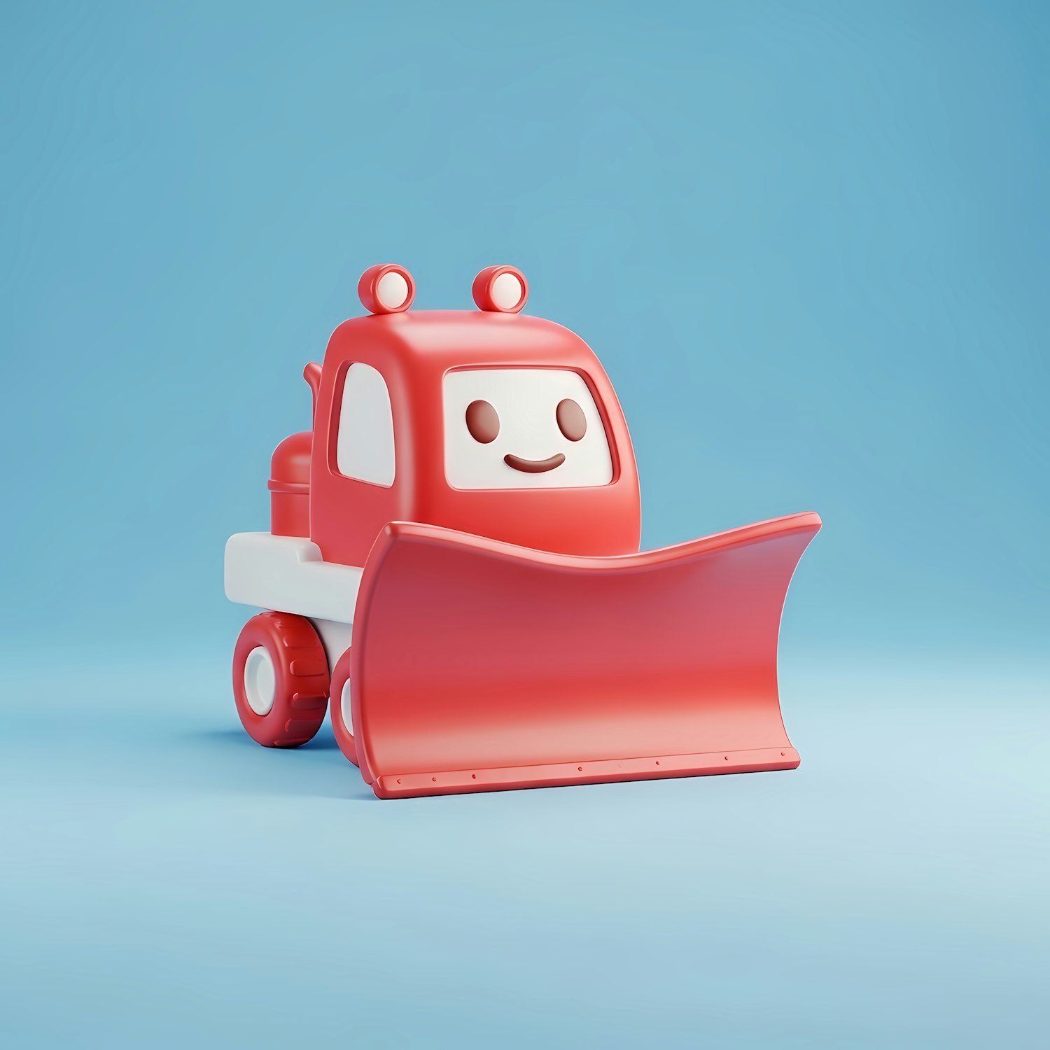 Adorable 3D cartoon red snowplow with a smiling face, set against a bright blue background. Perfect for kids' designs or playful themes.