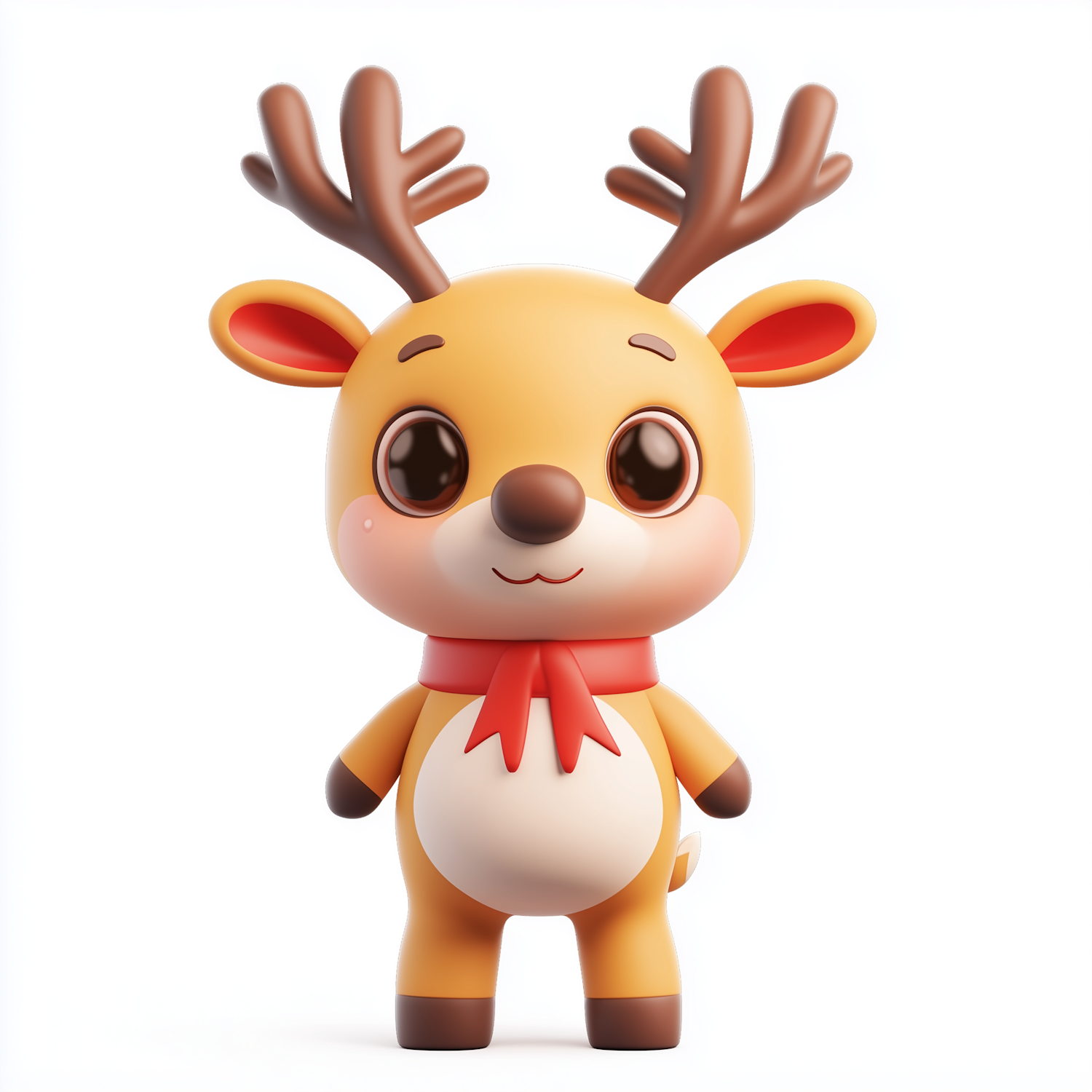 Adorable cartoon reindeer with big eyes and a red scarf, set against a white background. Perfect for festive themes.