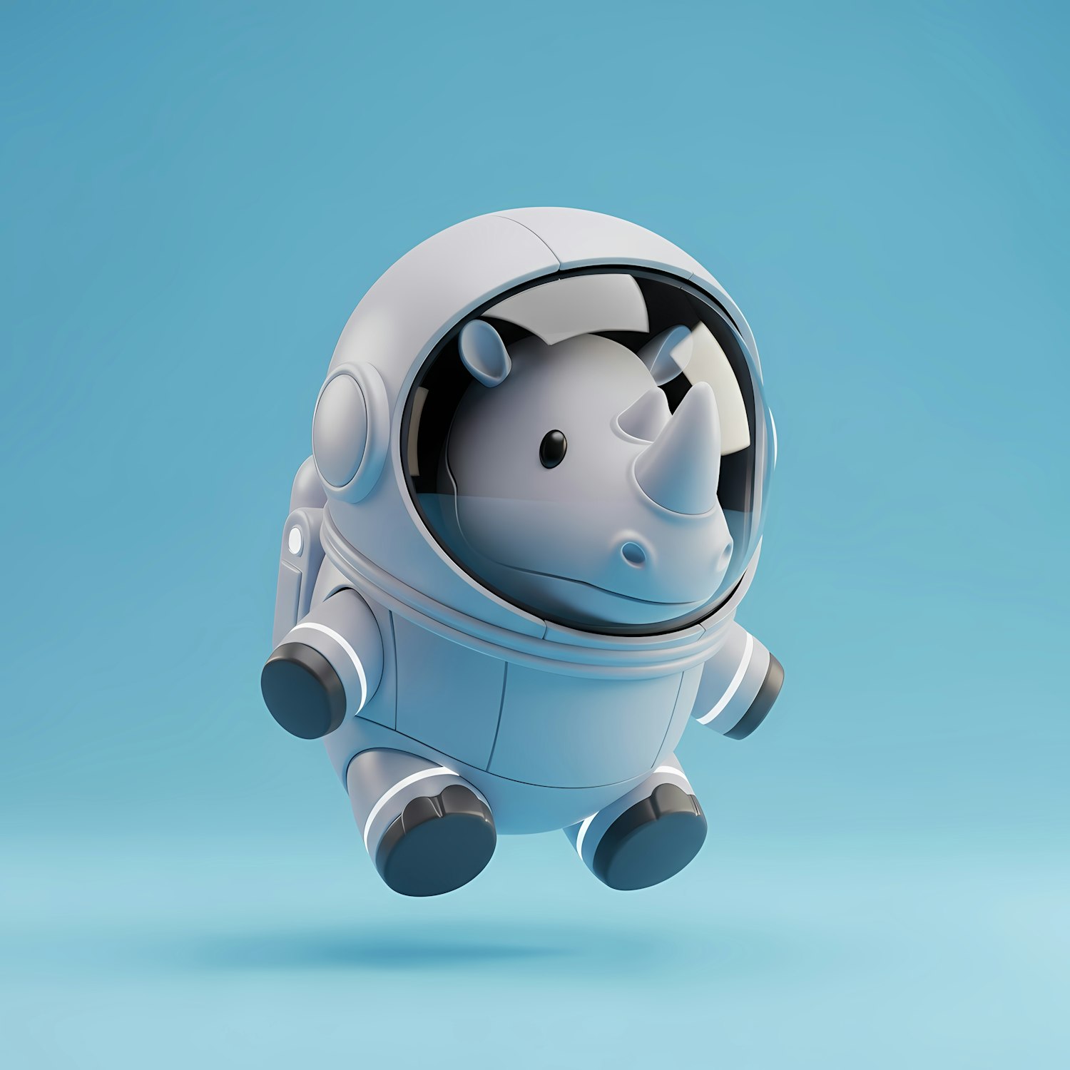 Adorable 3D cartoon rhino in a white astronaut suit floating in a light blue background. Perfect for space-themed fun!