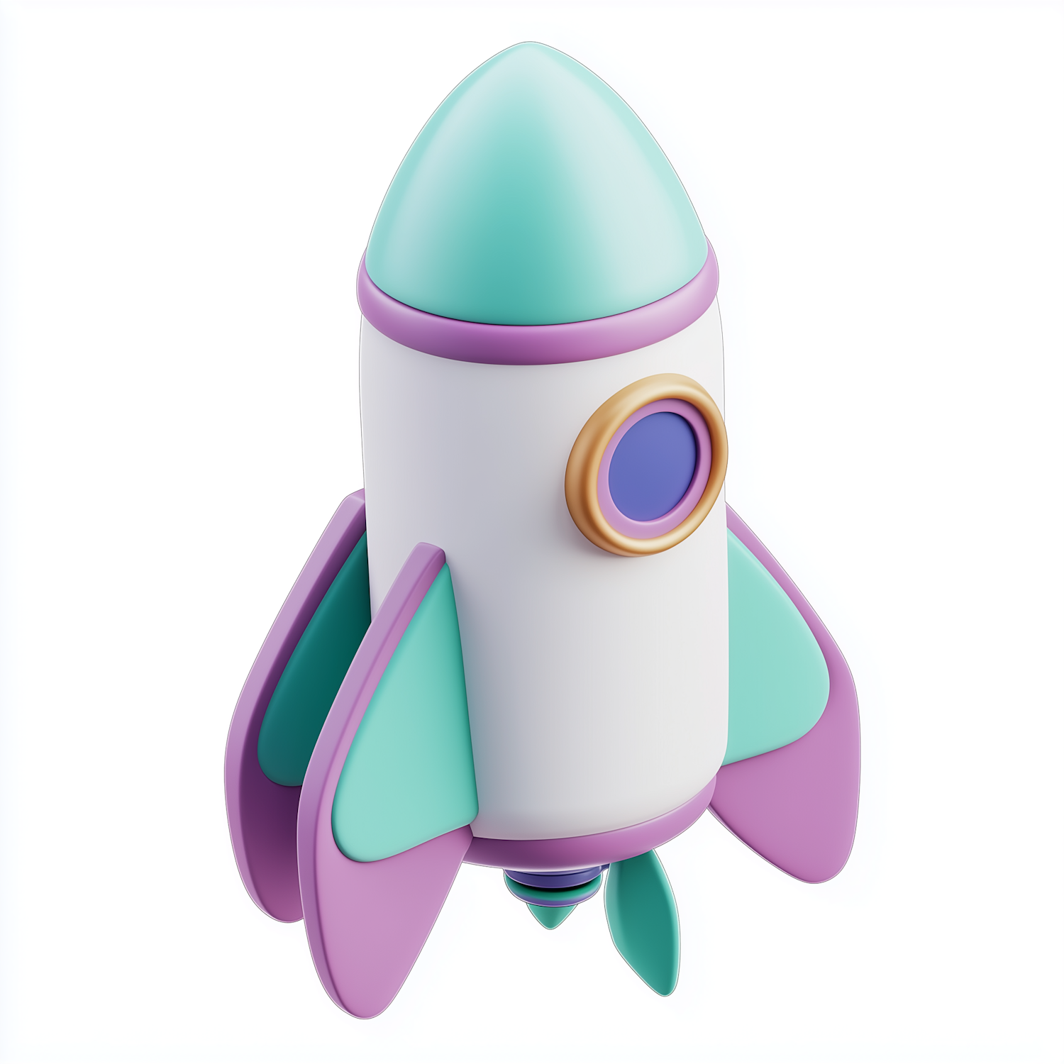 A colorful 3D cartoon rocket with mint green, purple, and gold accents, perfect for playful or futuristic designs.