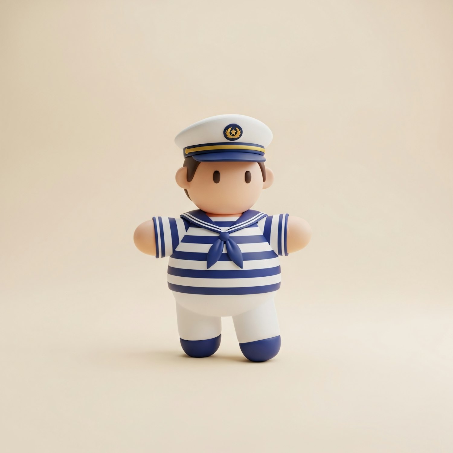 Adorable 3D sailor character in a striped outfit and hat, set against a soft beige background, perfect for nautical-themed designs.