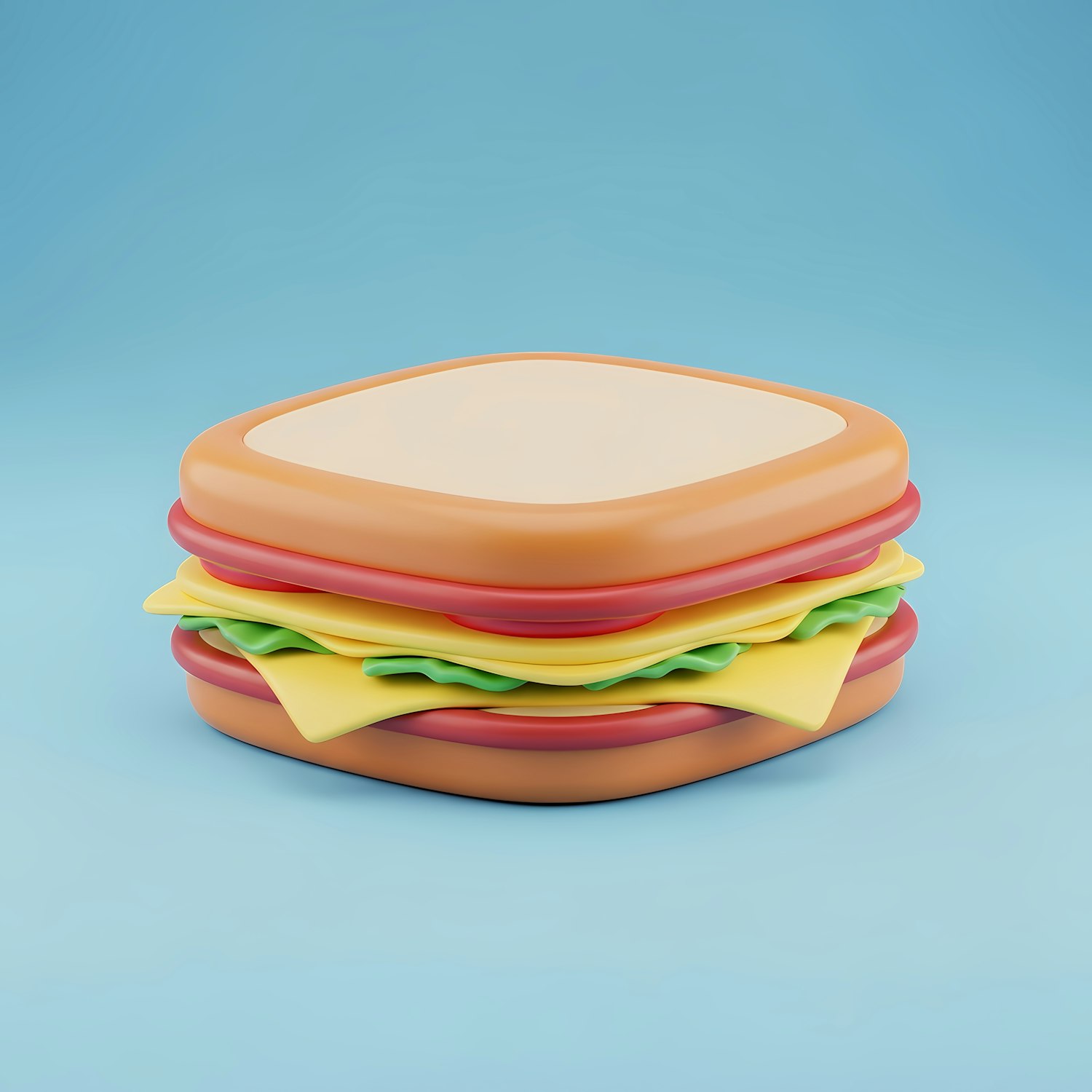 A fun and colorful 3D illustration of a sandwich with bread, lettuce, cheese, and meat layers on a light blue background.