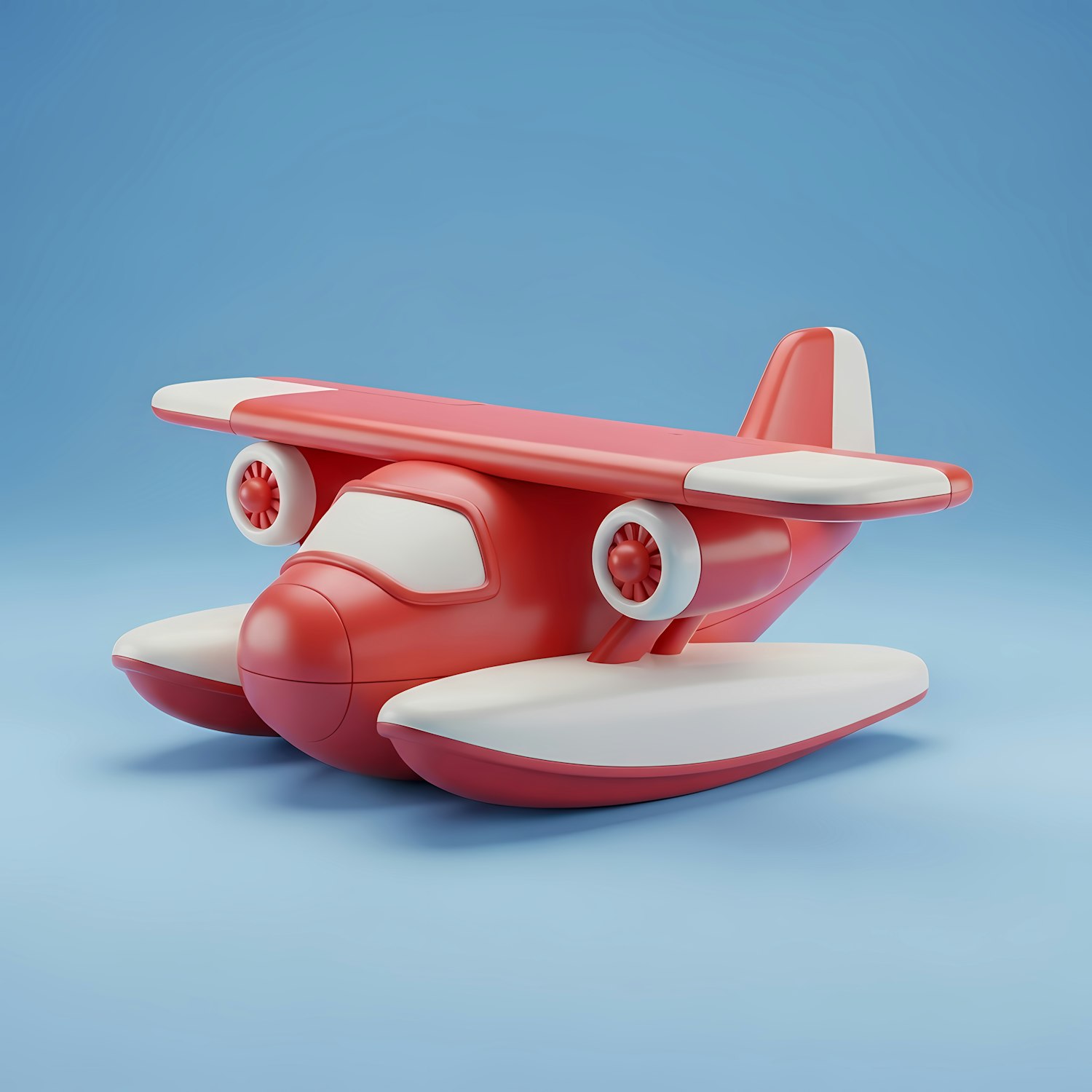 Adorable 3D-rendered red and white seaplane with a playful design, set against a light blue background. Perfect for toy or design inspiration.