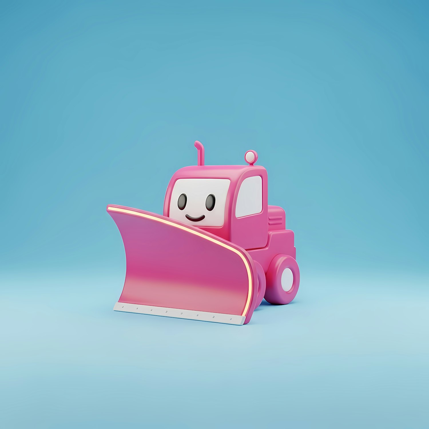 Adorable pink snowplow with a smiling face, perfect for kids' content or playful designs, set against a cheerful blue background.