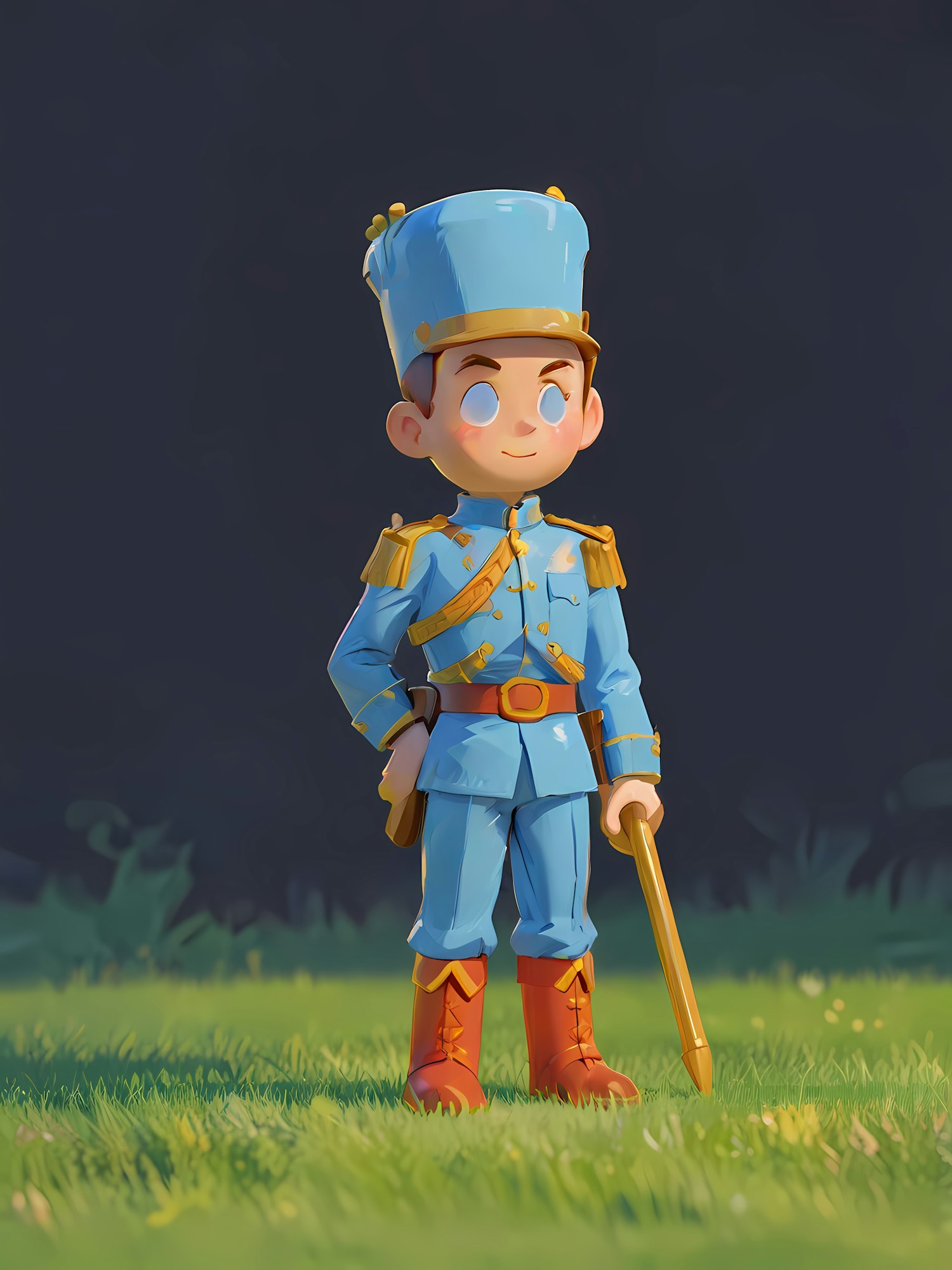 Adorable 3D cartoon soldier in a blue uniform with gold accents, holding a wooden staff, standing on a grassy field.