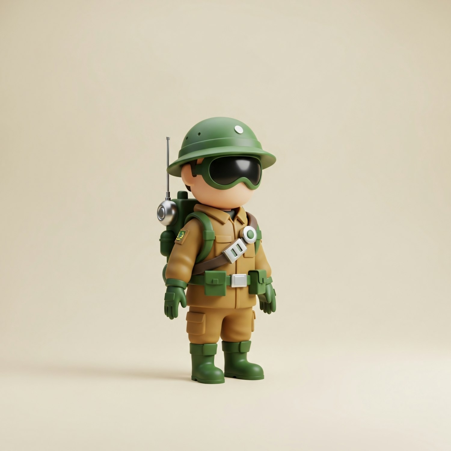 A 3D-rendered cartoon soldier in a tan uniform with green gear and a radio backpack, set against a plain beige background.
