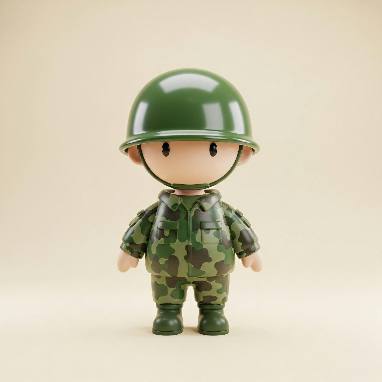 A cute 3D cartoon soldier in green camouflage and helmet, set against a plain beige background, perfect for playful or illustrative themes.