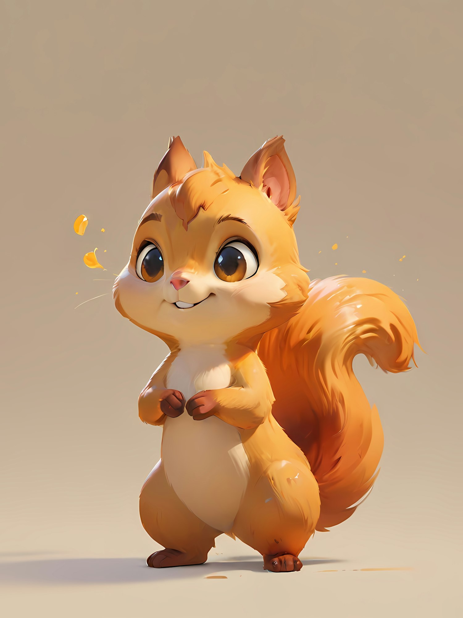Adorable cartoon squirrel with big blue eyes, fluffy orange fur, and a playful expression on a beige background. Perfect for kids' content!