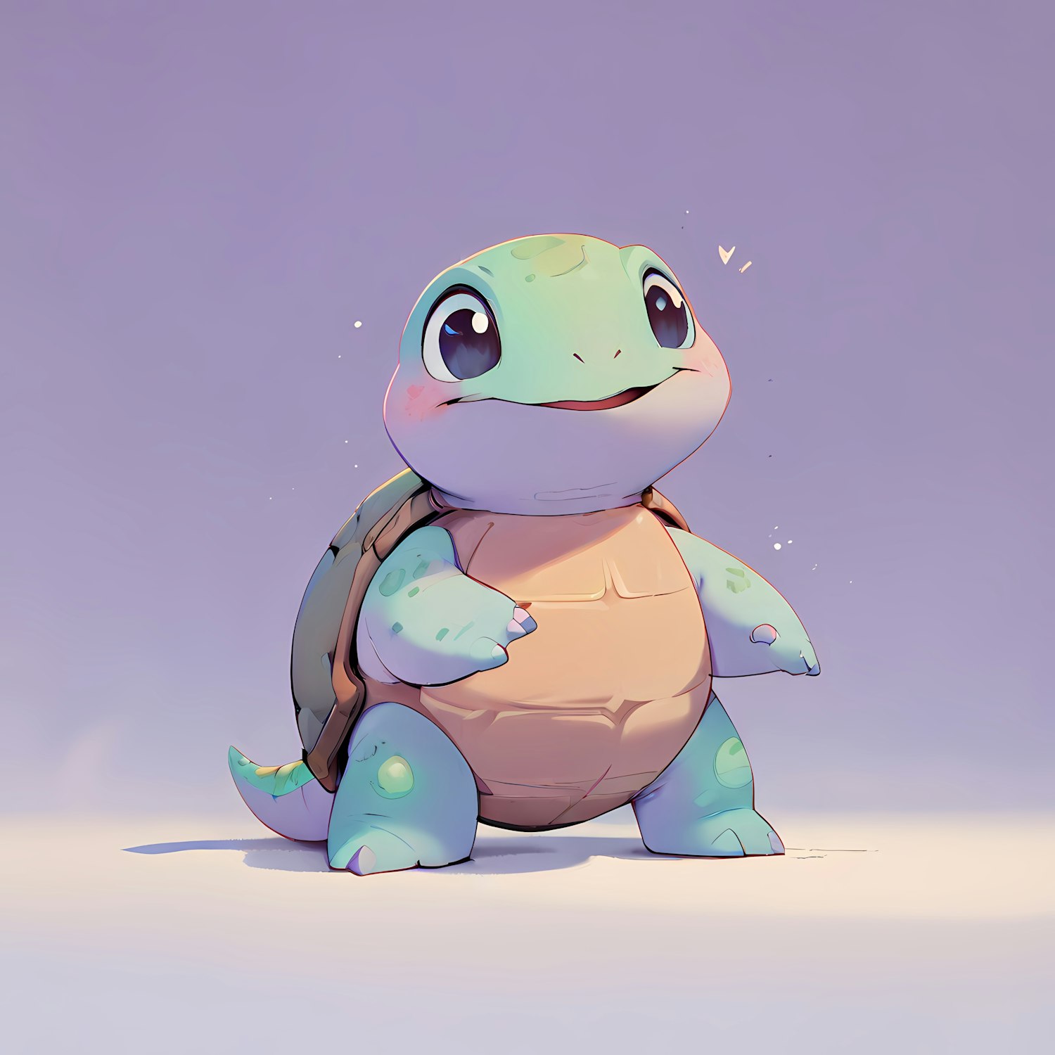 Adorable cartoon turtle with big eyes and a blushed face against a soft purple background, exuding charm and whimsy.