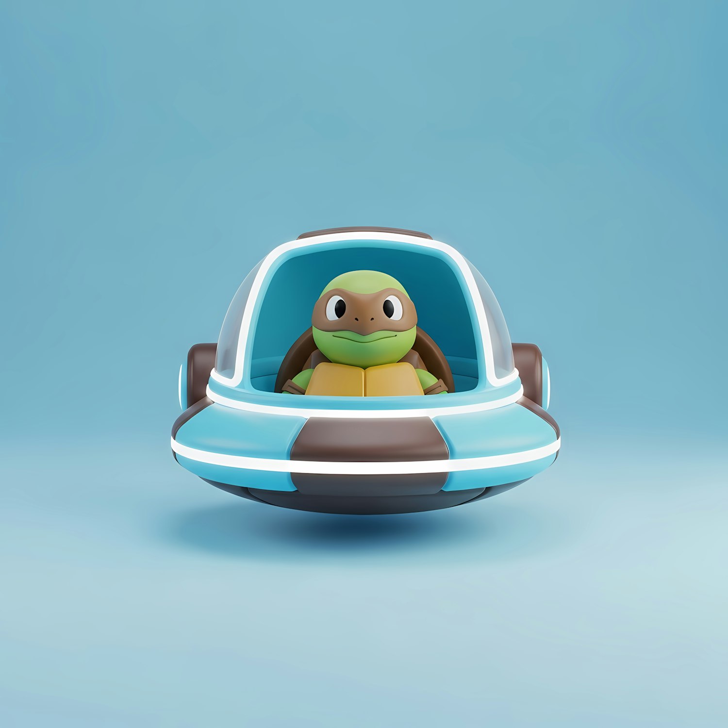 Adorable 3D turtle character piloting a futuristic blue flying saucer, perfect for whimsical and fun designs.