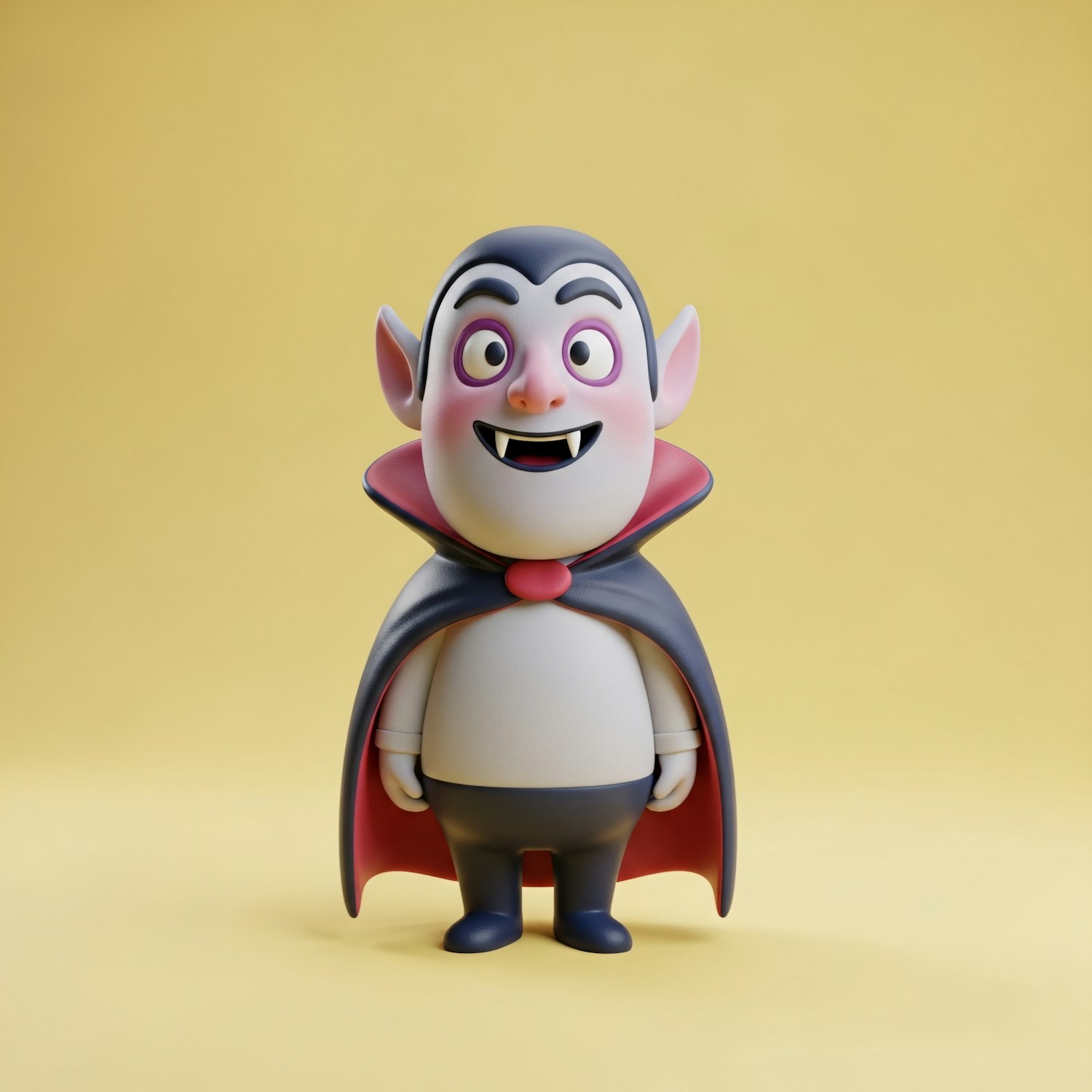 A cute cartoon vampire with a black cape and fangs, set against a yellow background, perfect for Halloween-themed designs.