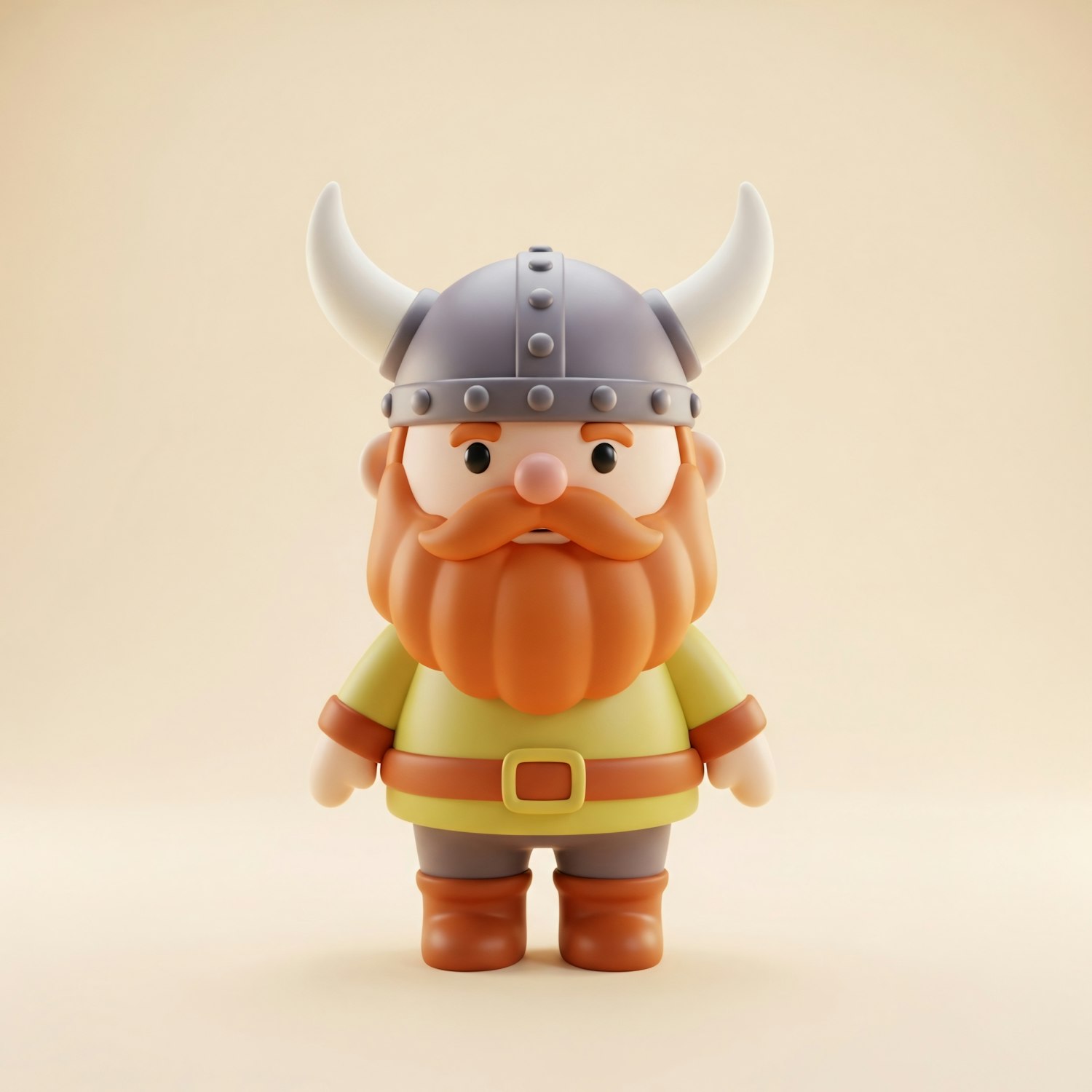 A cute 3D Viking character with a horned helmet, orange beard, and colorful outfit, perfect for playful or creative projects.