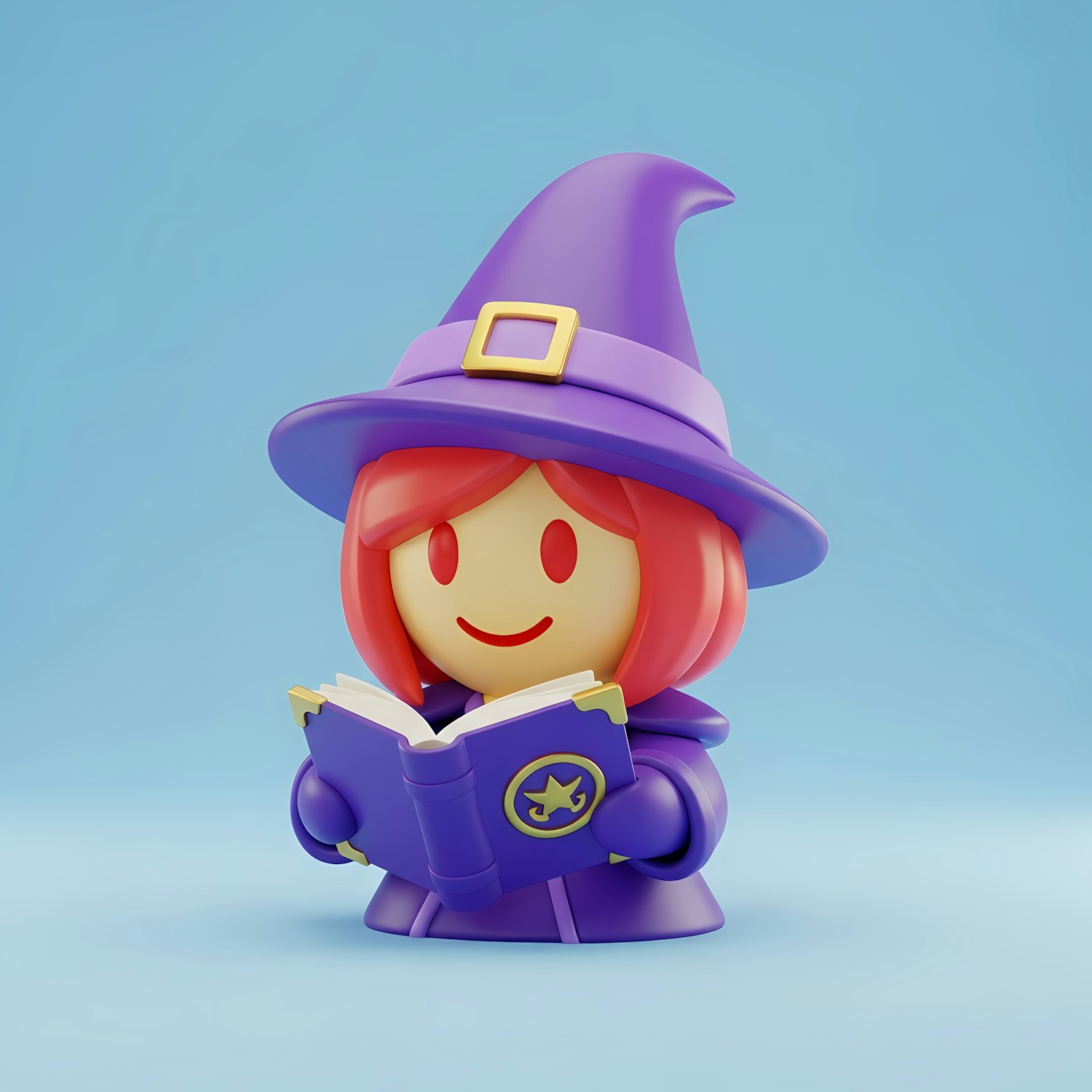 Adorable 3D cartoon witch with a purple hat and robe, holding a magical book against a light blue background.