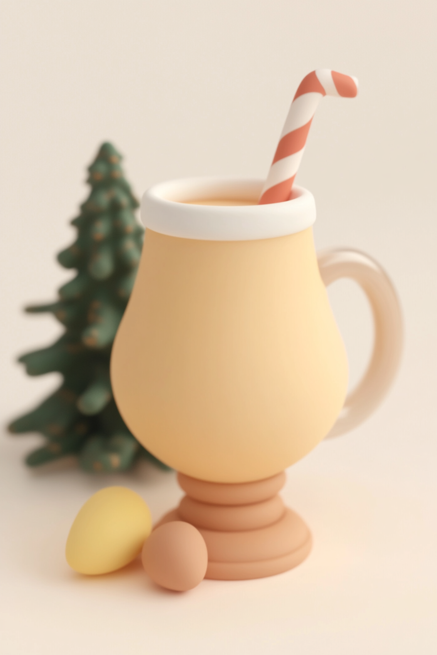 Cartoonish mug with striped straw, festive tree, and egg shapes create a whimsical holiday scene.