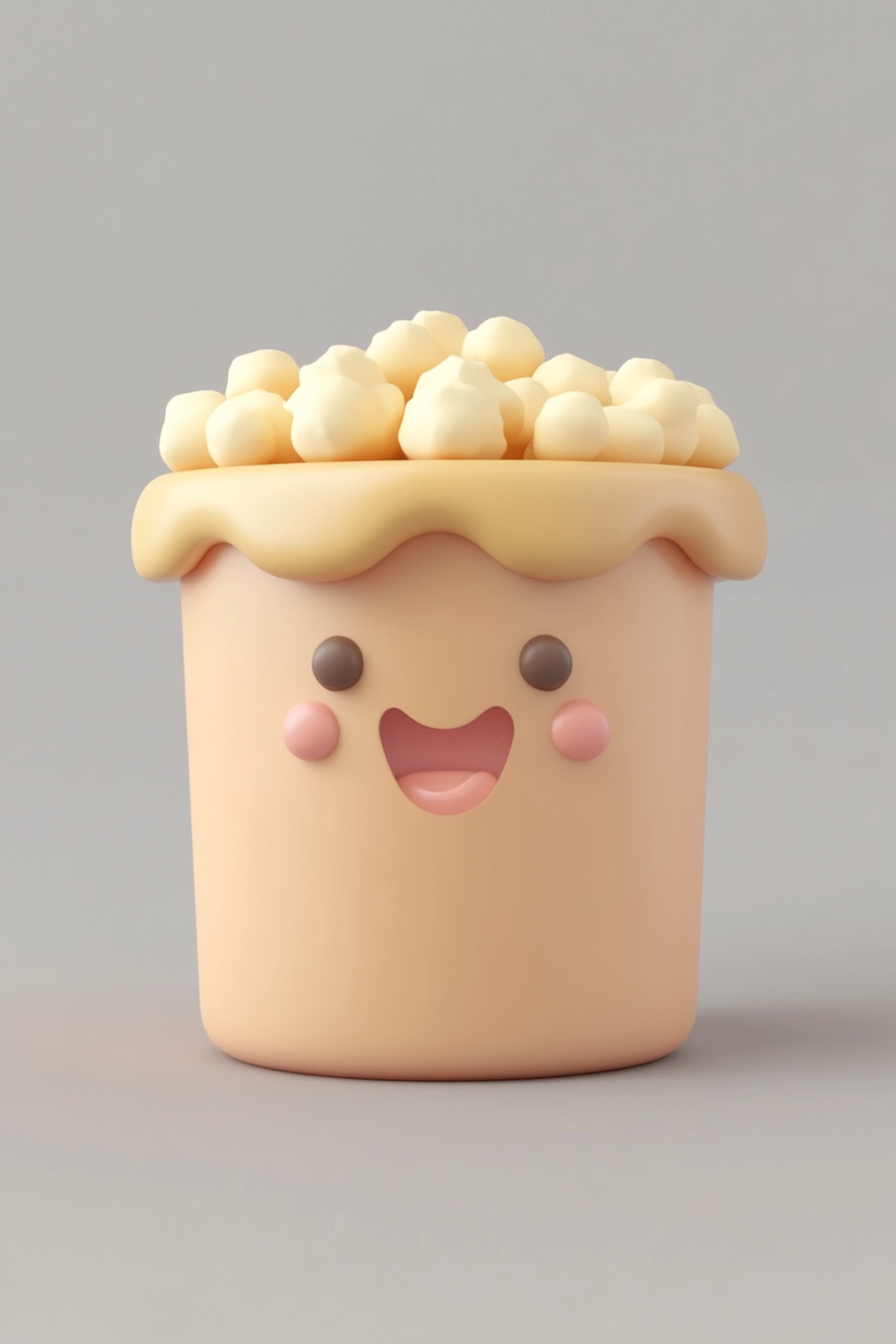 Adorable 3D popcorn bucket with a smiling face and fluffy popcorn on top, set against a neutral gray background.