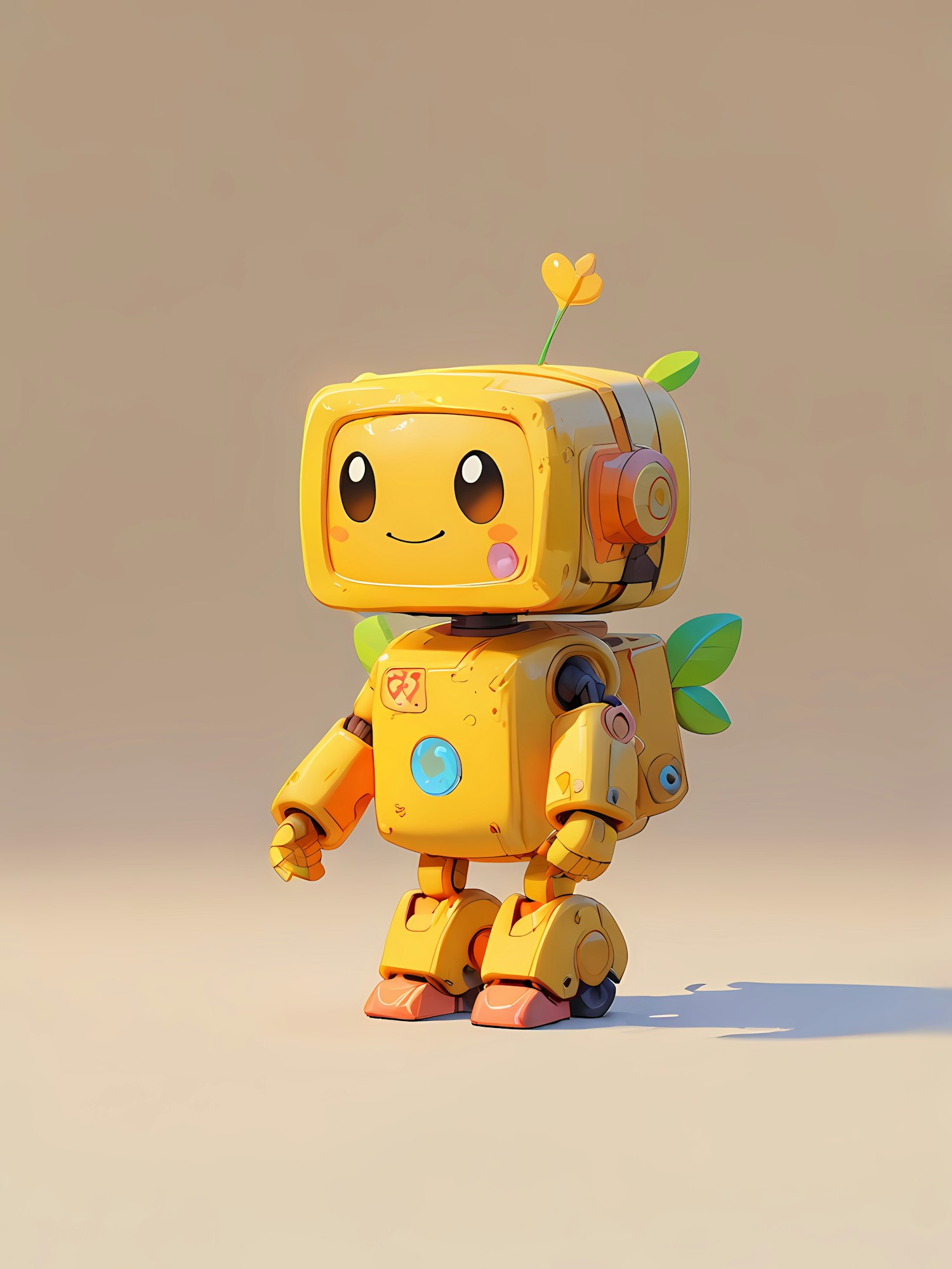 Adorable yellow robot with a sprout and flower on its head, expressive eyes, and nature-inspired details. Perfect mix of tech and whimsy!