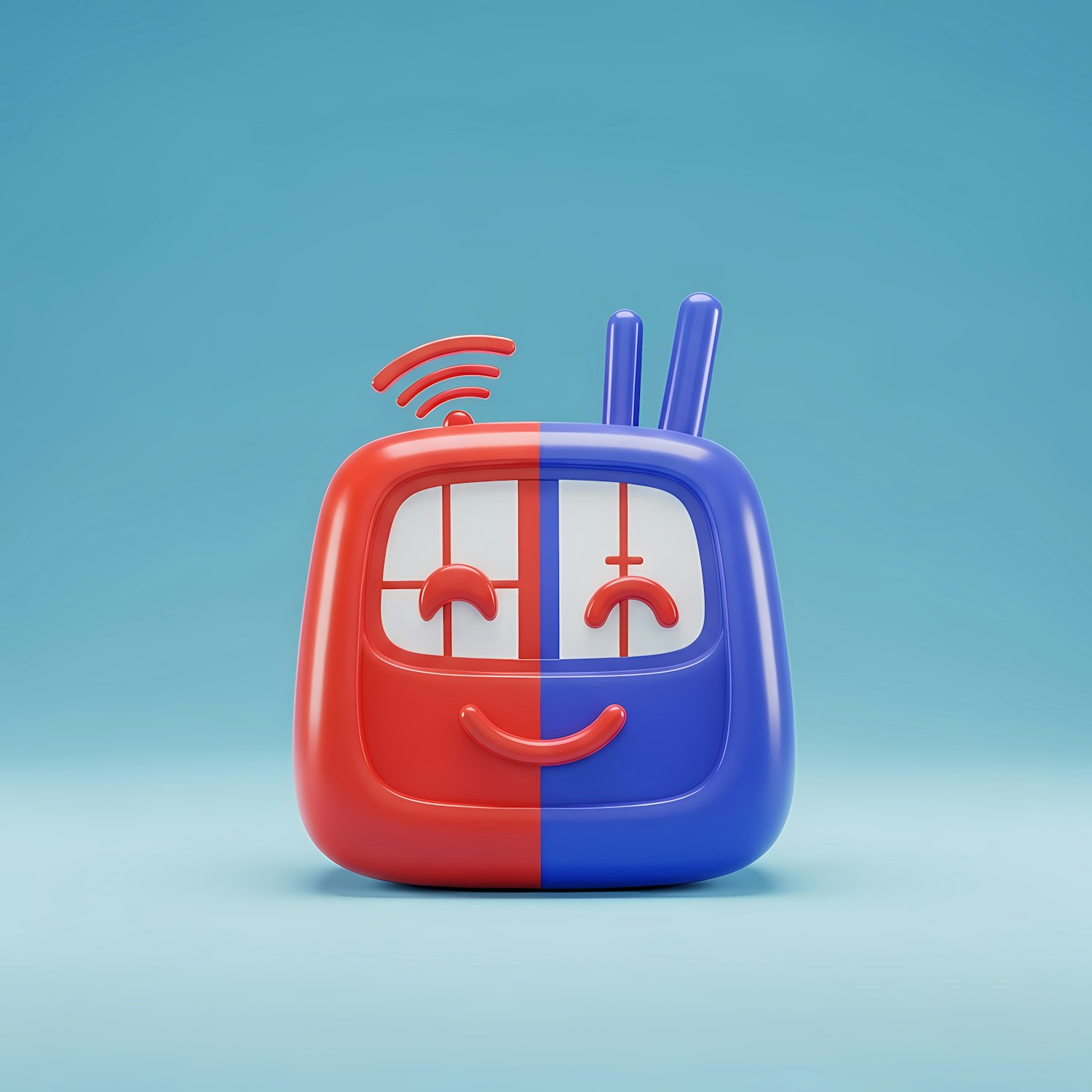 Cute 3D cartoon TV character with red and blue split design, smiling face, and antenna details on a light blue background.