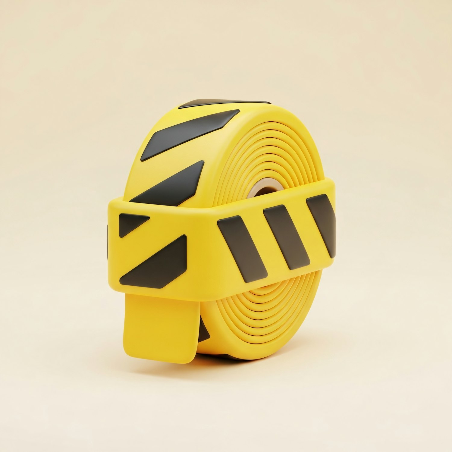 A roll of yellow tape with black diagonal stripes, resembling caution tape, neatly coiled and displayed against a neutral background.