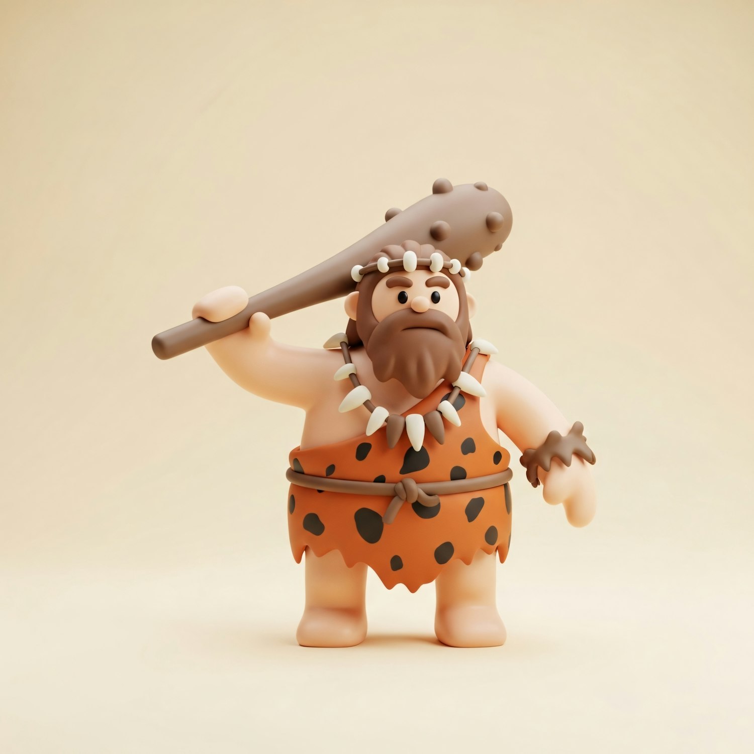 A cartoon caveman with a club, wearing a spotted tunic and bone necklace, set against a plain beige background.