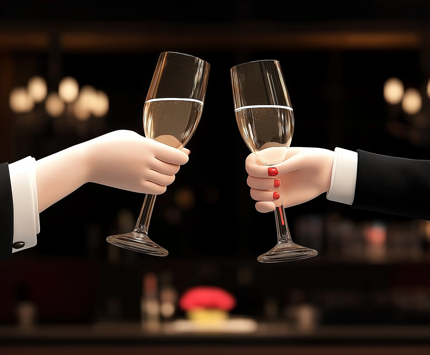 Animated hands clinking champagne glasses in a celebratory toast, set against a blurred, elegant background.