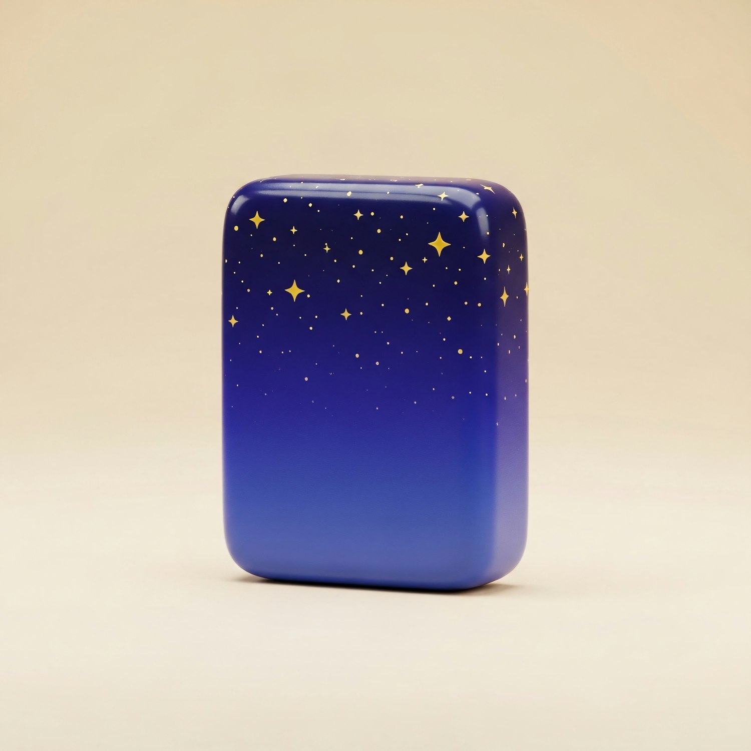 A glossy blue rectangular object with golden star patterns, set against a neutral background, showcasing a celestial design.