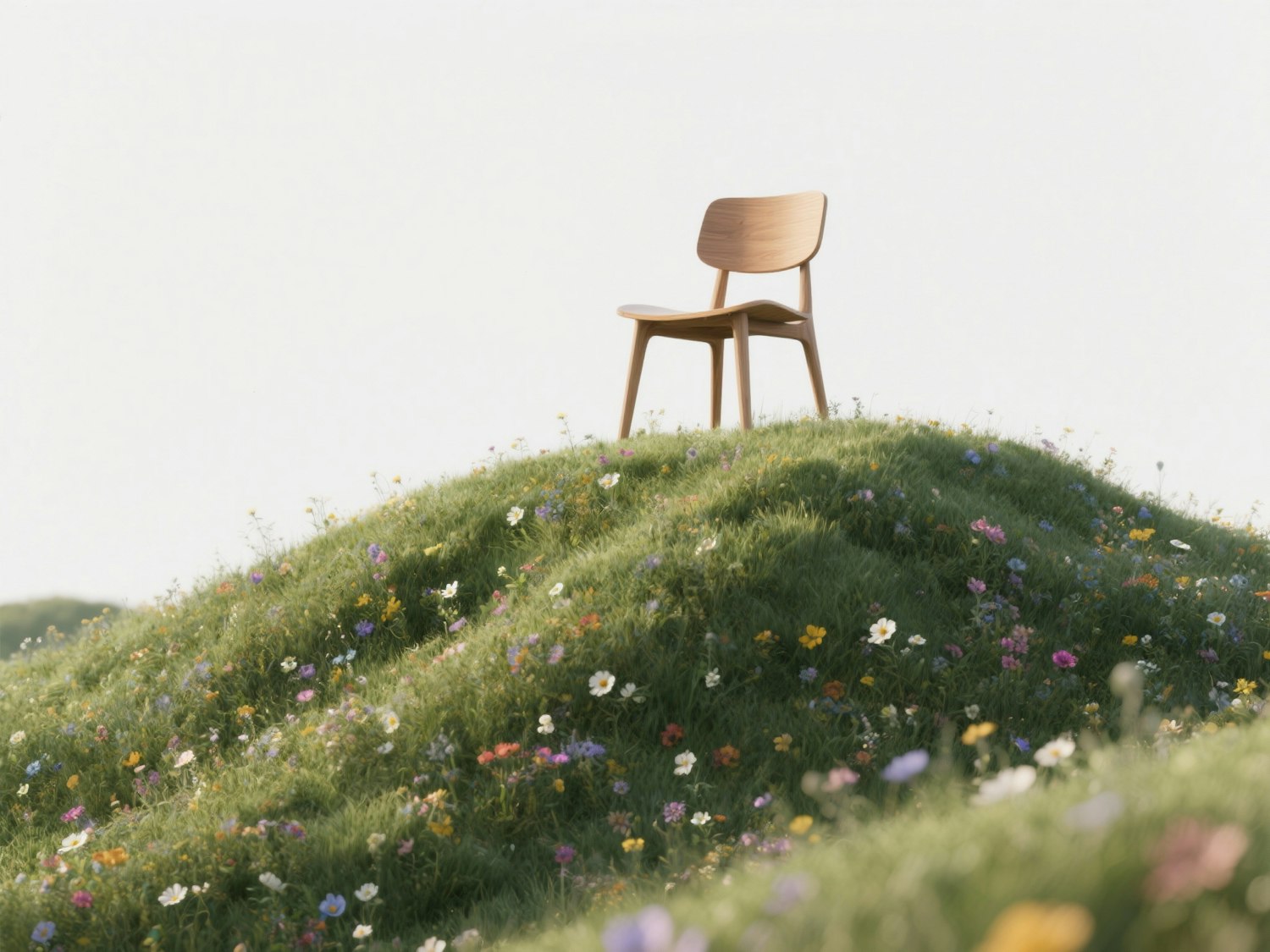 A wooden chair sits on a grassy hill adorned with colorful wildflowers, under a bright sky, creating a serene and minimalist scene.
