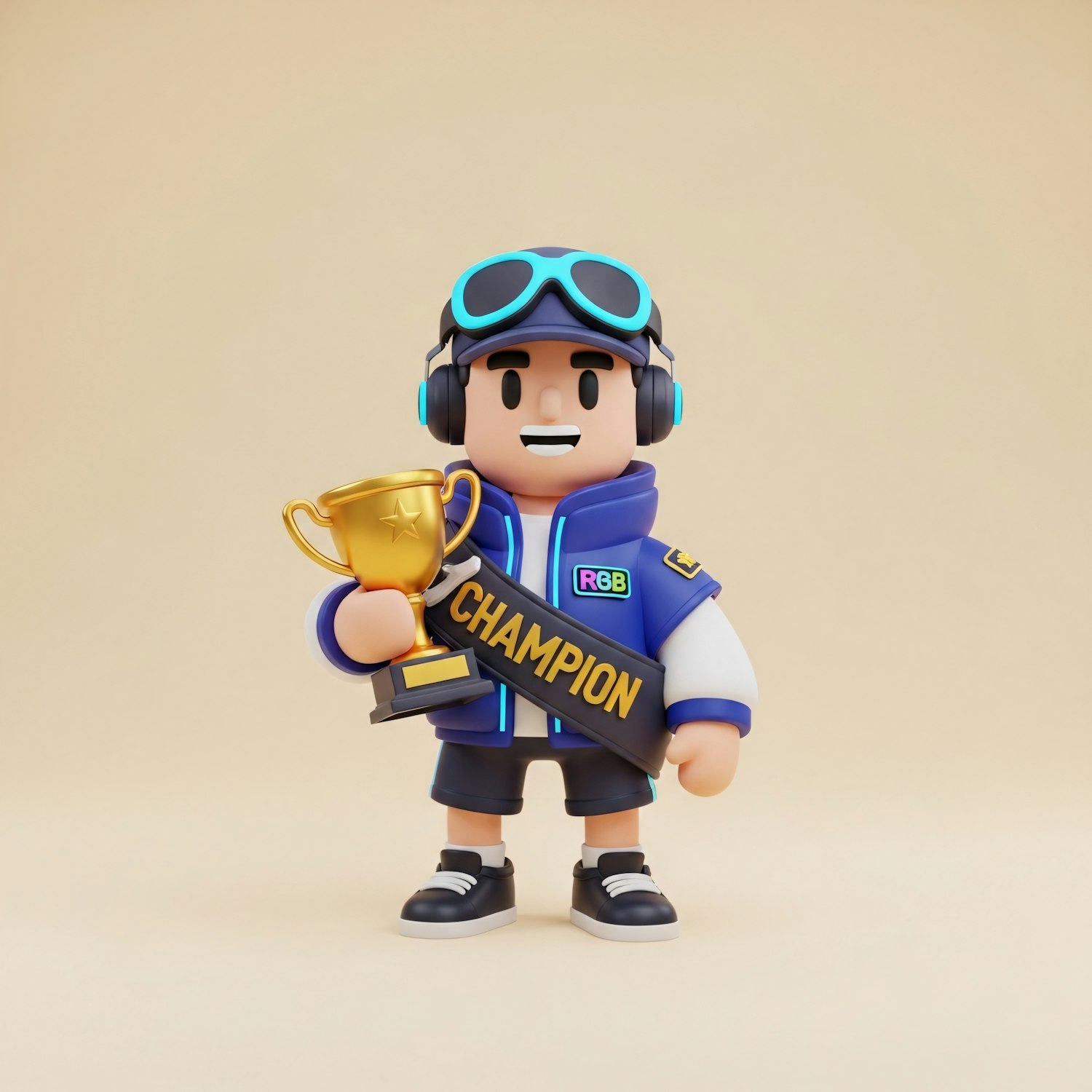 A 3D character in a blue jacket and champion sash holds a golden trophy, standing against a beige background.