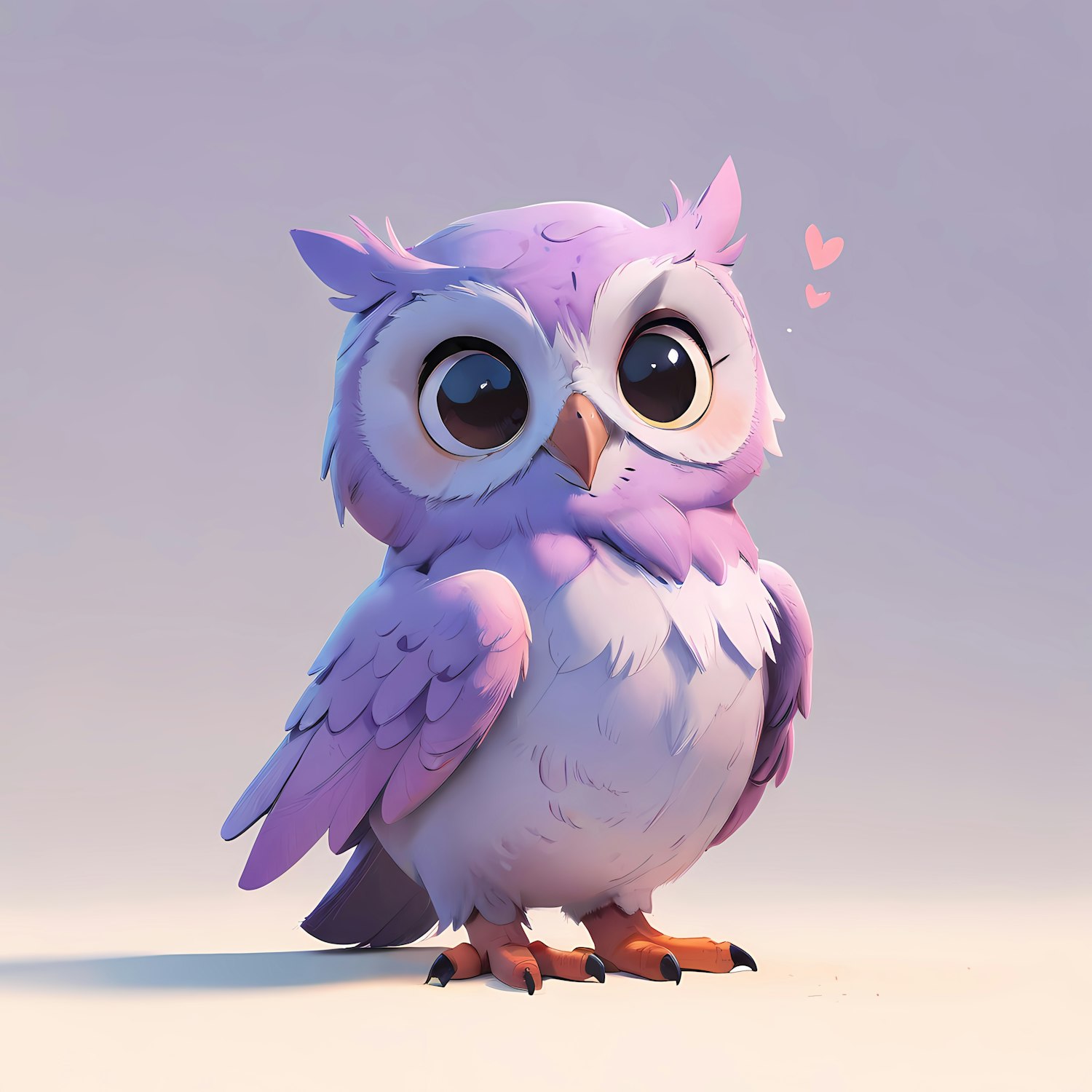 Adorable cartoon owl with big eyes and purple feathers, surrounded by pink hearts. Perfect for a cute and whimsical vibe.