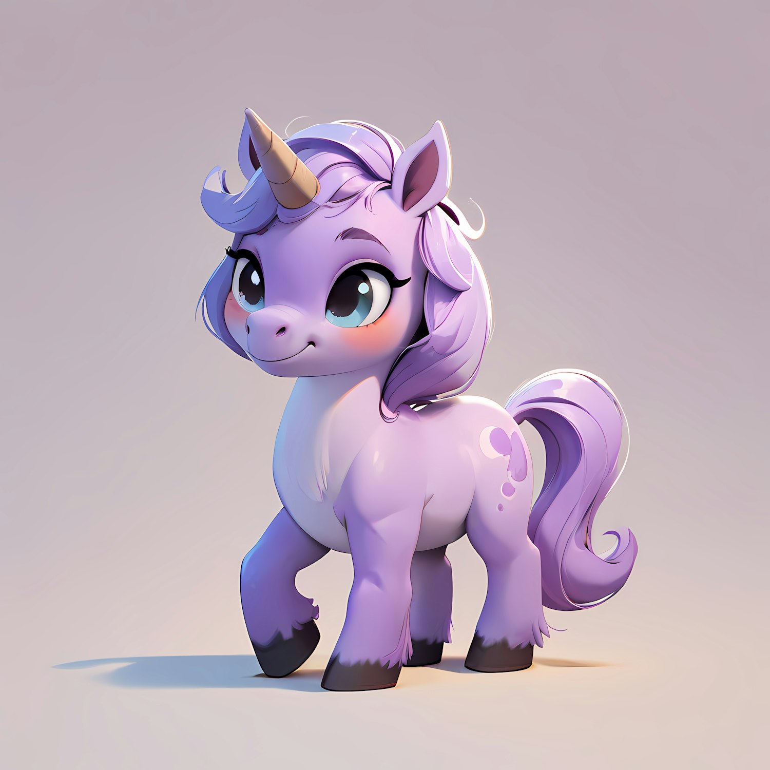 Adorable cartoon unicorn with lavender body, purple mane, and golden horn. Large blue eyes and a whimsical expression.