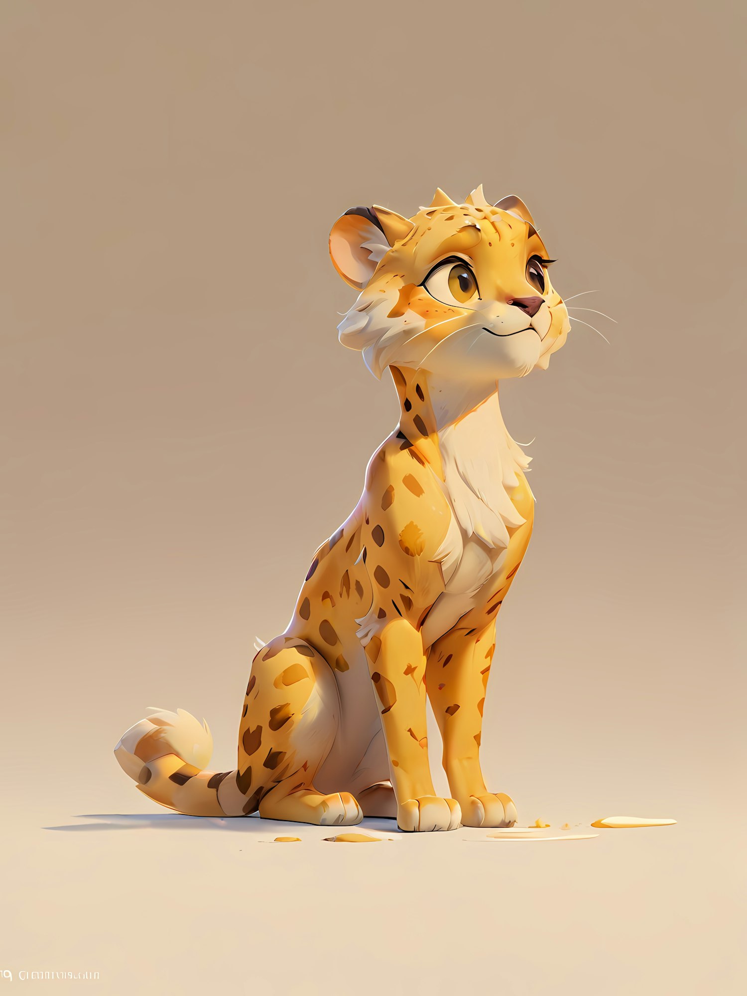 Adorable animated cheetah with golden fur and playful expression sitting on a beige background. Perfect for animal lovers and art enthusiasts.