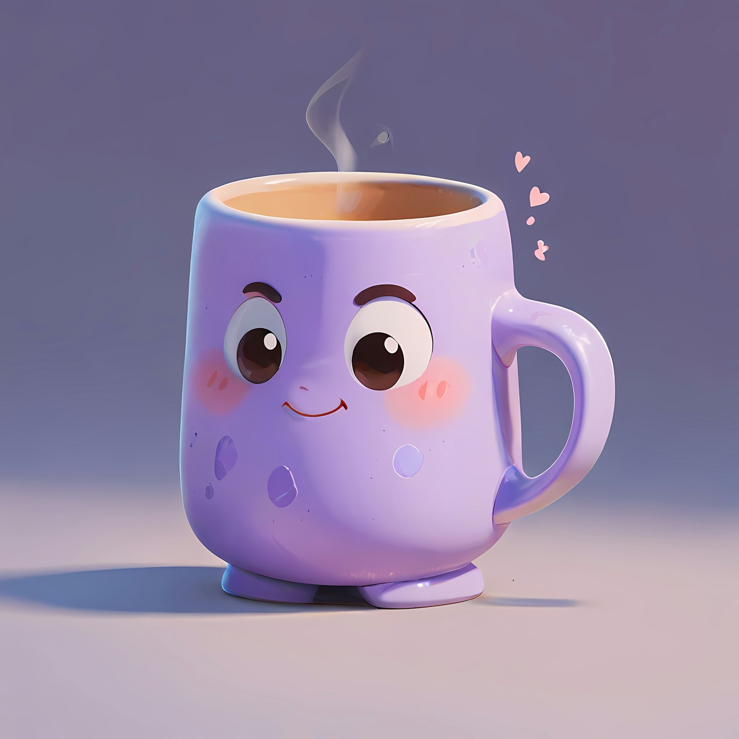 Cute purple mug with a smiling face and steam, surrounded by floating hearts, on a soft purple background.