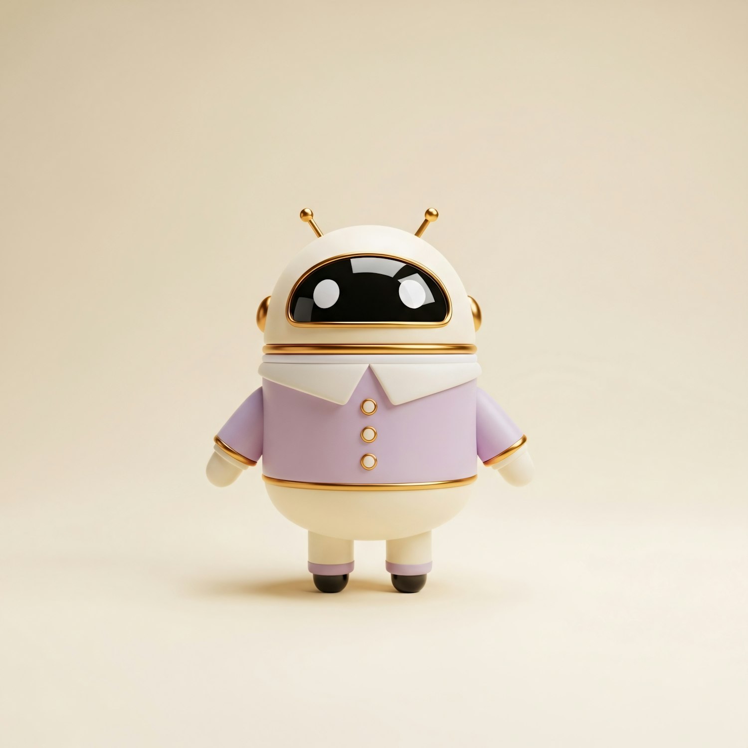 Adorable robot character in pastel purple attire with gold accents, featuring a glossy black faceplate and a neutral background.