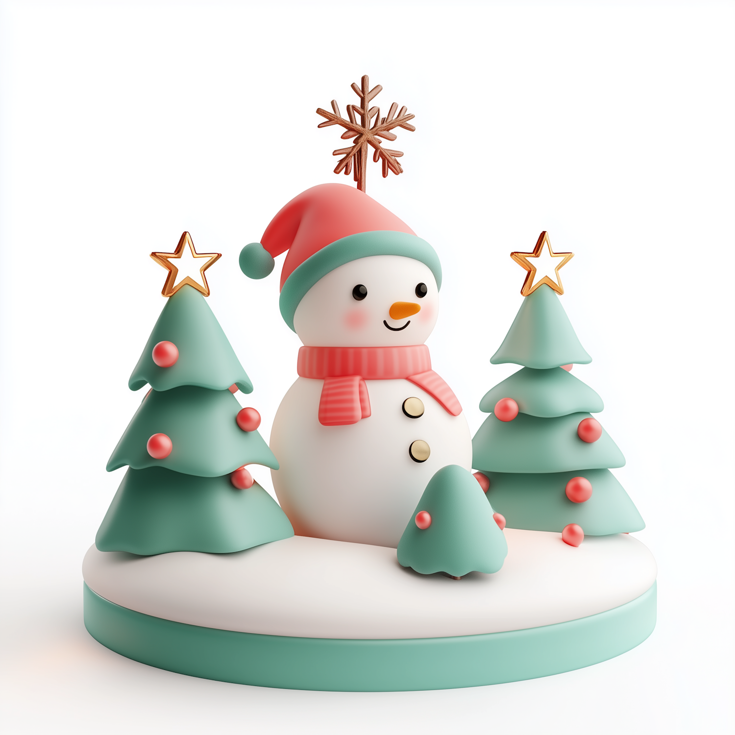 Whimsical 3D illustration of a snowman with festive trees, red hat, scarf, and snowflake. Perfect for holiday-themed designs.