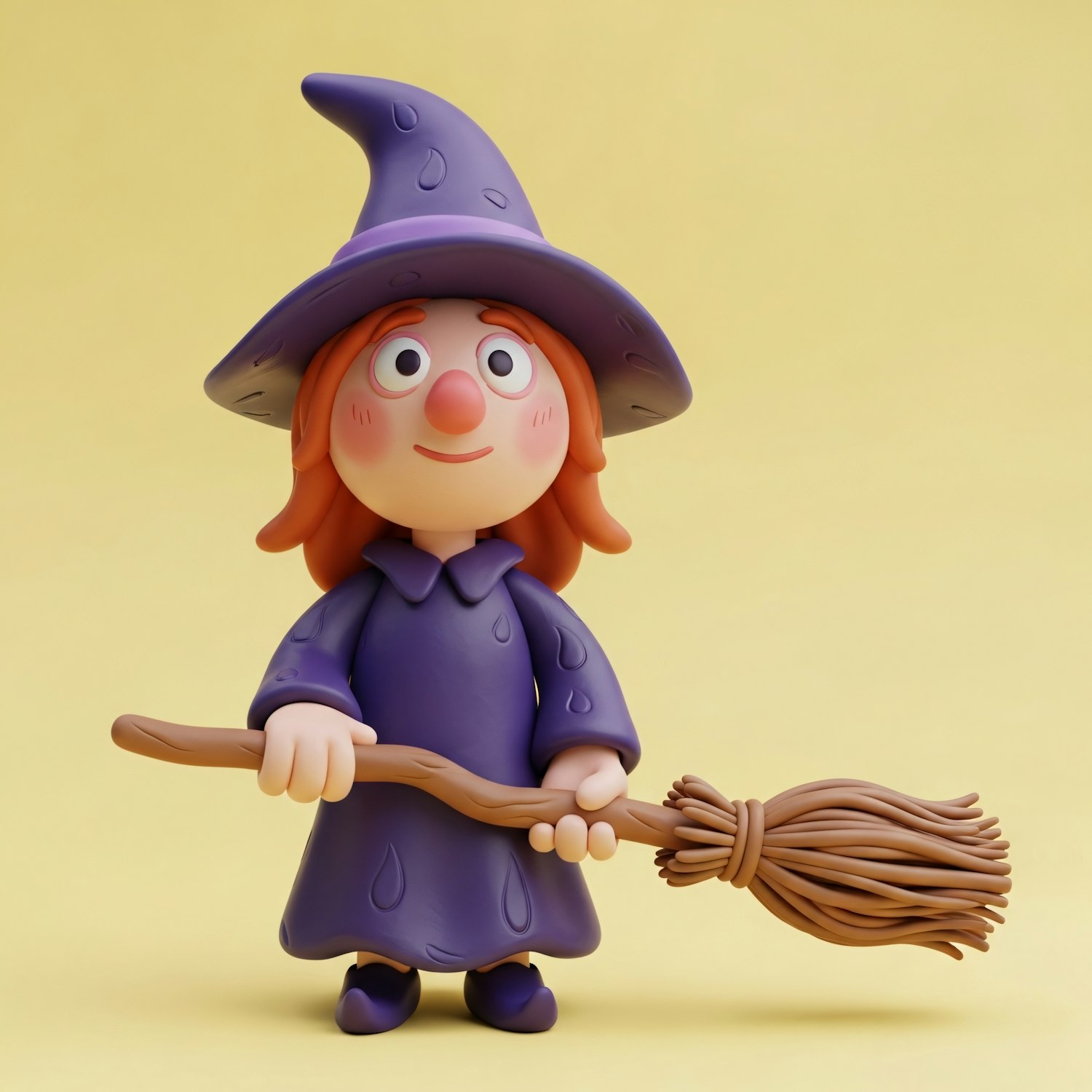 A cute clay-style witch with a purple outfit and broomstick, set against a soft yellow background. Perfect for Halloween themes.