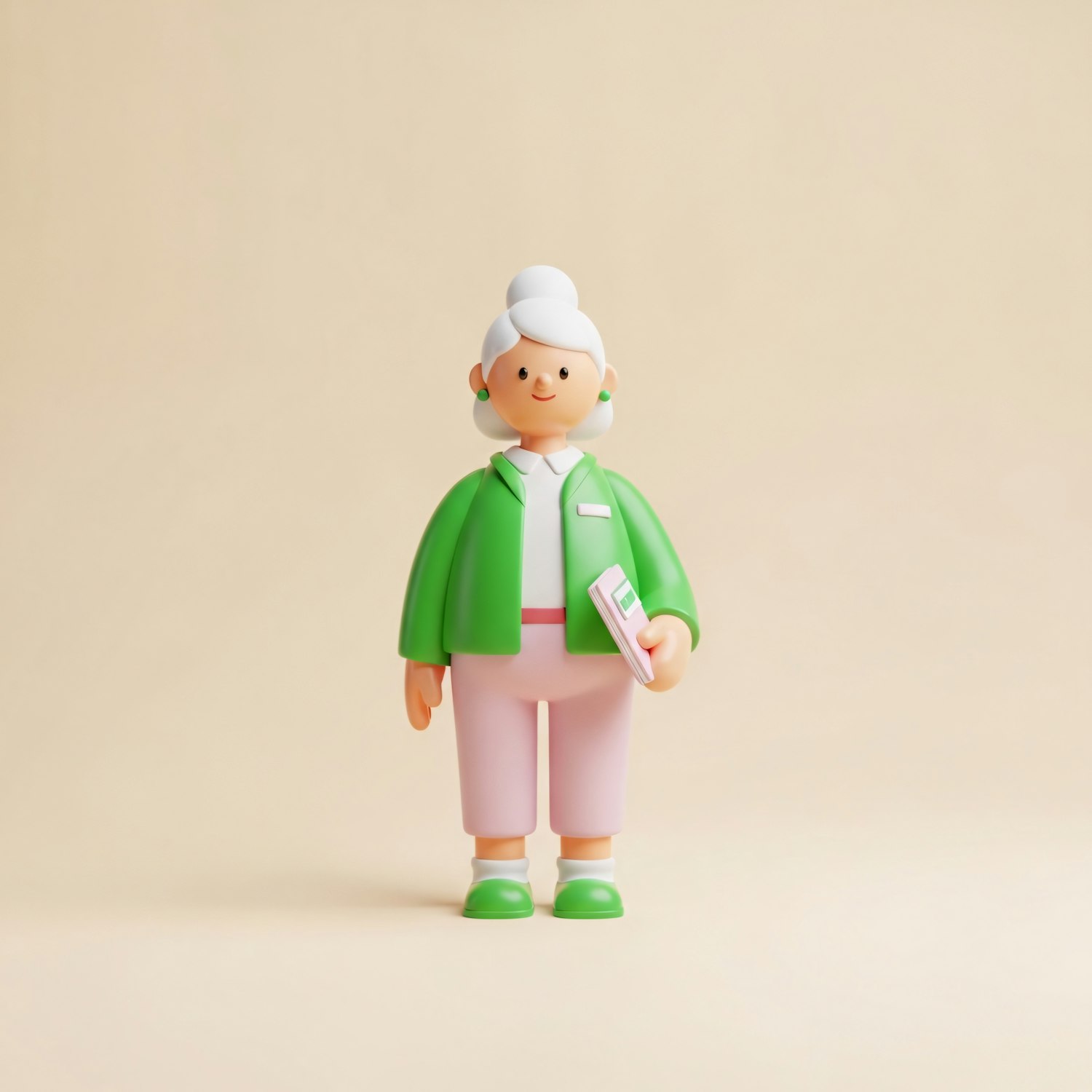 A charming 3D illustration of a character in a green jacket and pink pants, holding a book, set against a beige background.