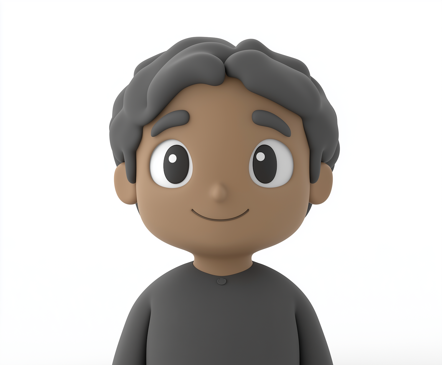 3D cartoon character with medium brown skin, dark gray hair, and large black eyes, wearing a dark gray shirt on a white background.