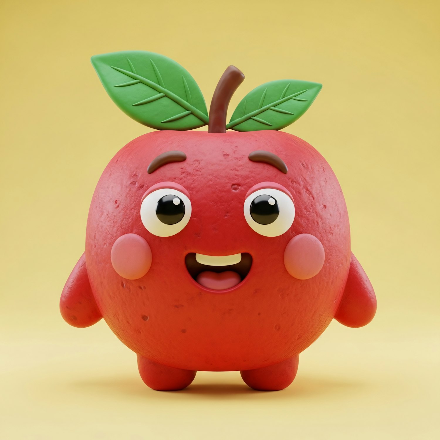 A cute 3D apple character with a big smile, expressive eyes, and green leaves on a yellow background. Perfect for fun and playful designs.