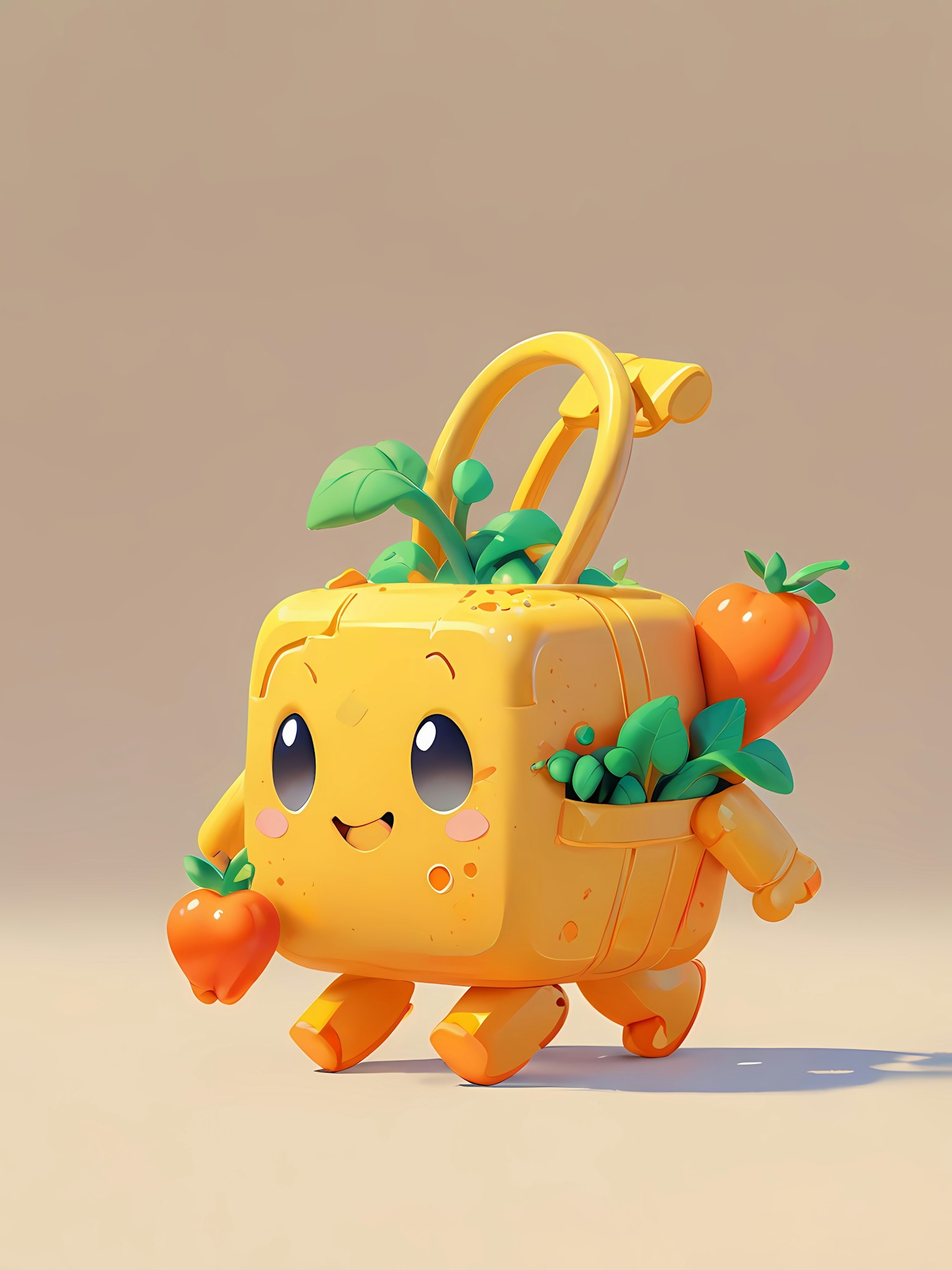 Adorable 3D basket character filled with veggies, holding a carrot, and radiating charm with its cheerful face and vibrant colors.