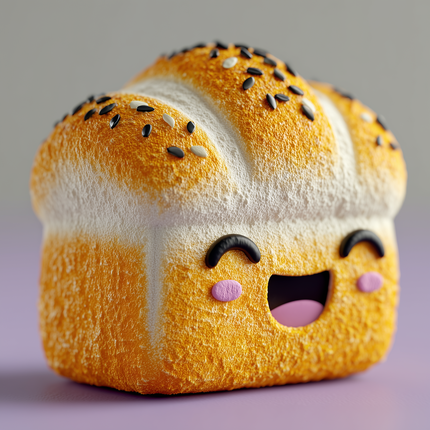 A cute 3D-rendered loaf of bread with a smiling face and sesame seeds on top, set against a soft purple background.