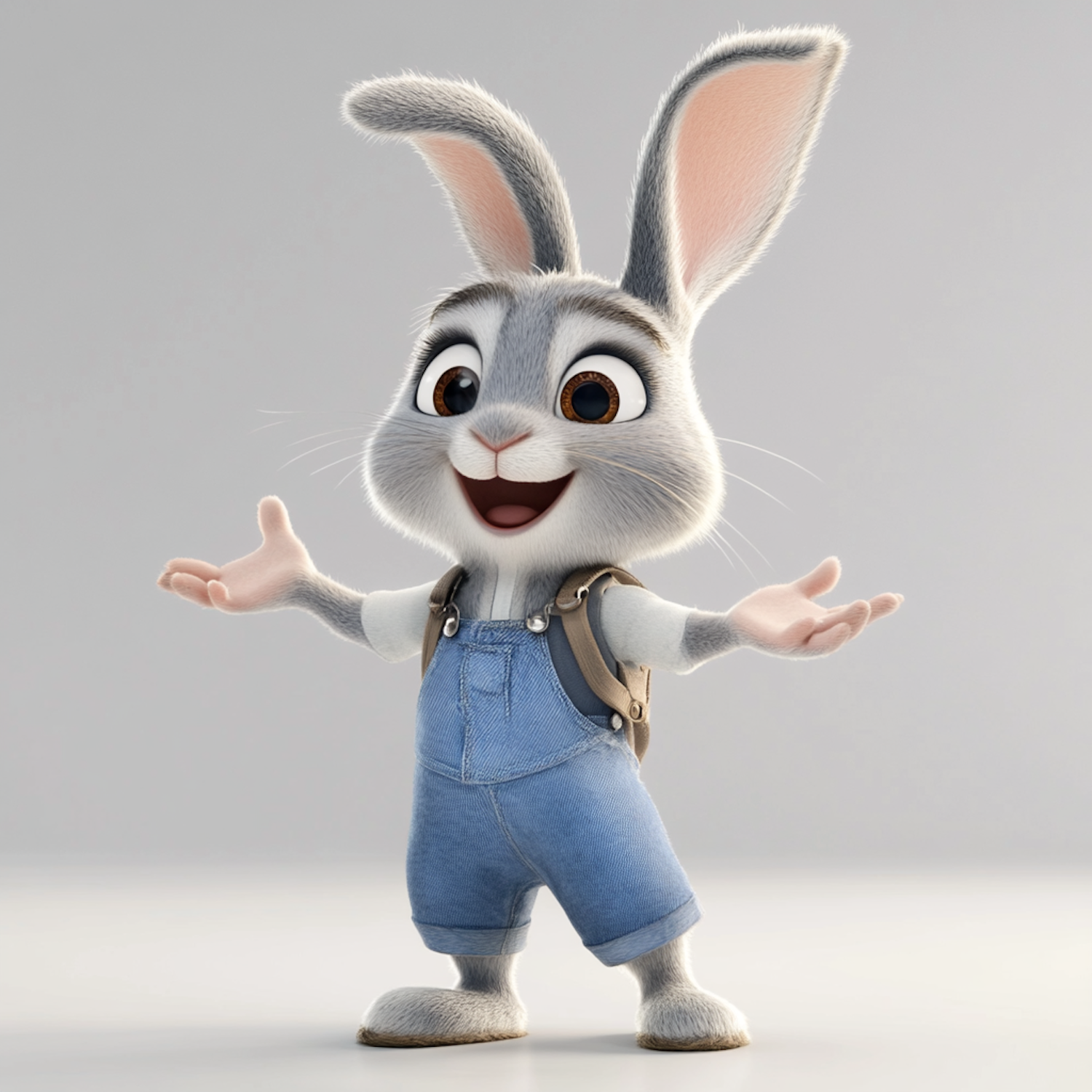 Adorable animated bunny in blue overalls and a backpack, spreading joy with open arms and a big smile on a light gray background.