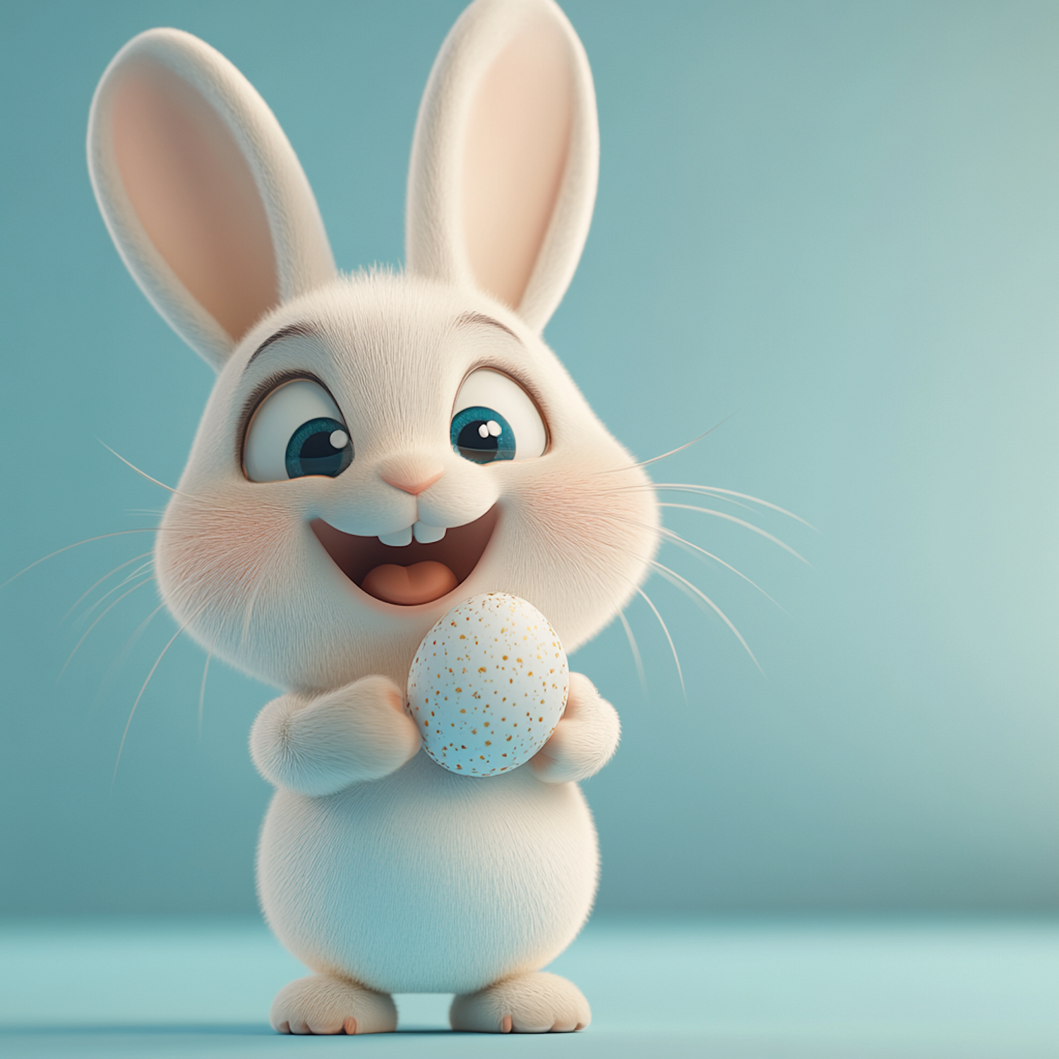 Adorable animated white bunny holding a speckled egg with a joyful smile against a light blue background. Perfect for Easter or festive themes!