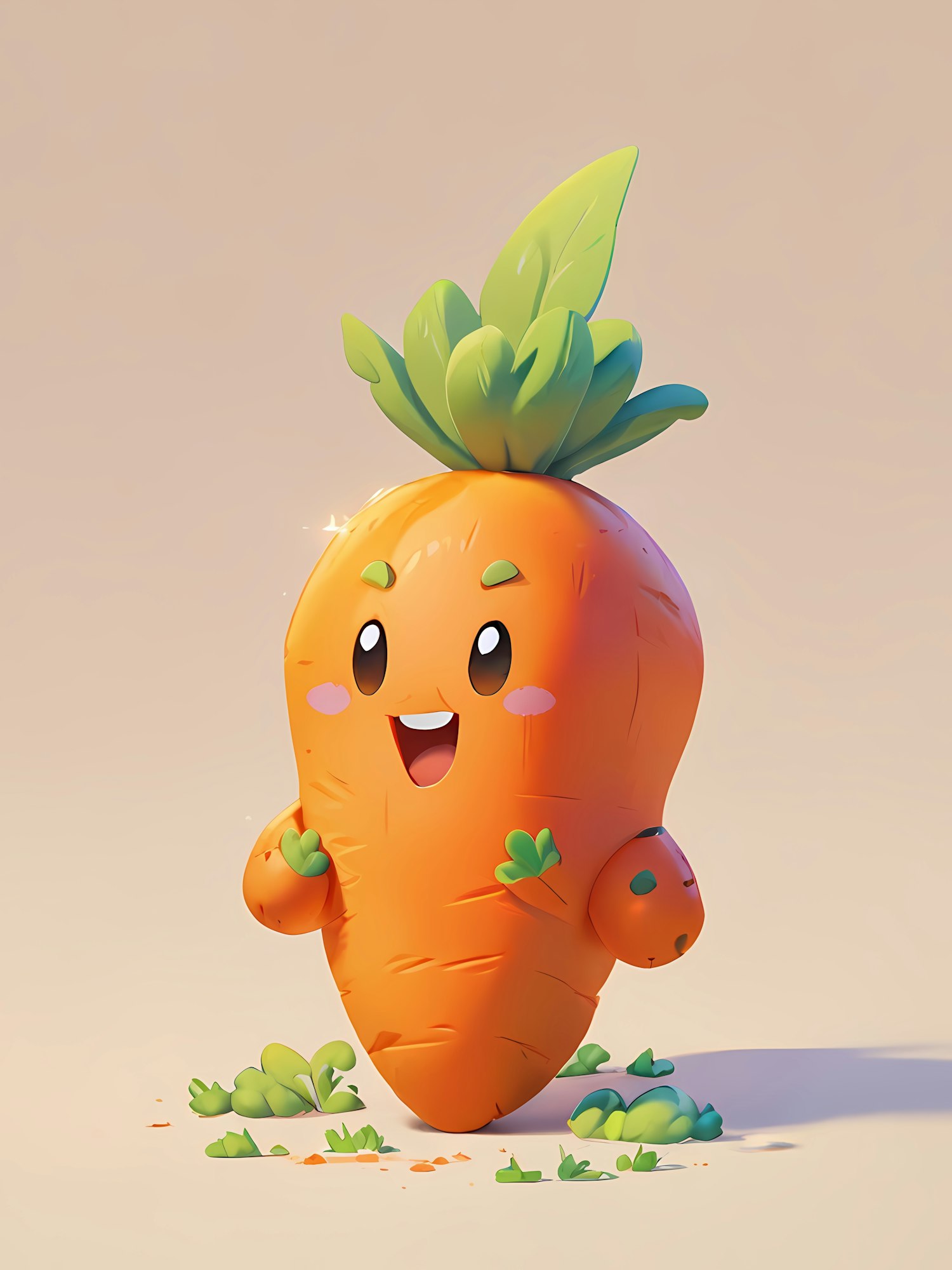 Adorable cartoon carrot character with a big smile, green leafy top, and playful details on a soft beige background.