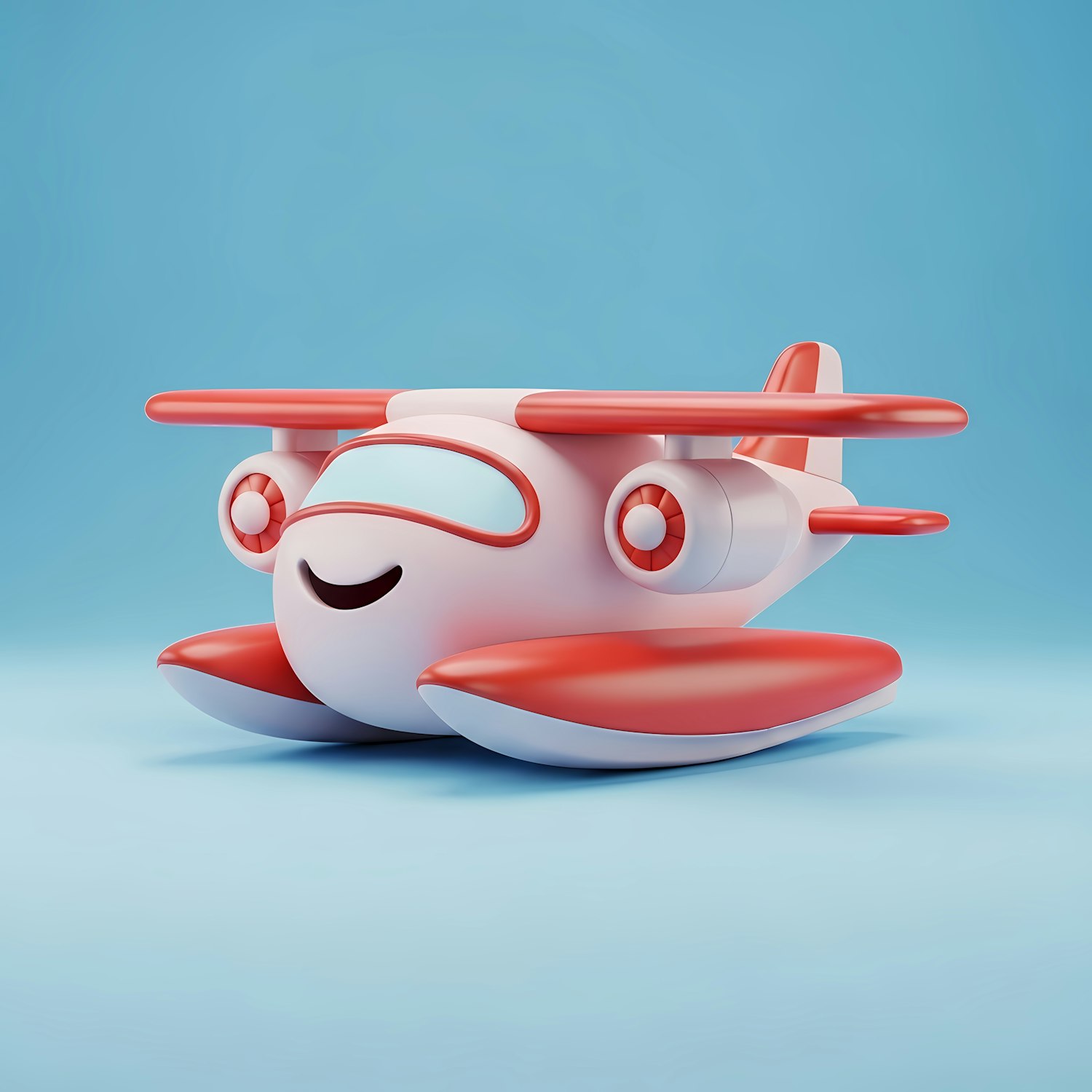 Adorable 3D cartoon airplane with a smiling face, red and white design, and a playful vibe against a light blue background.