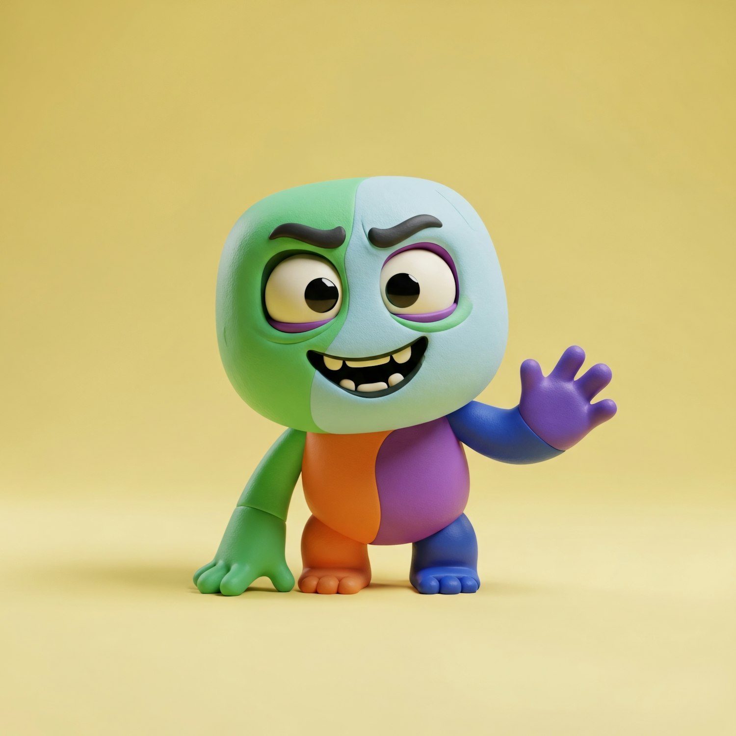 A vibrant cartoon character with a patchwork of colors and a cheerful expression waves against a yellow background.